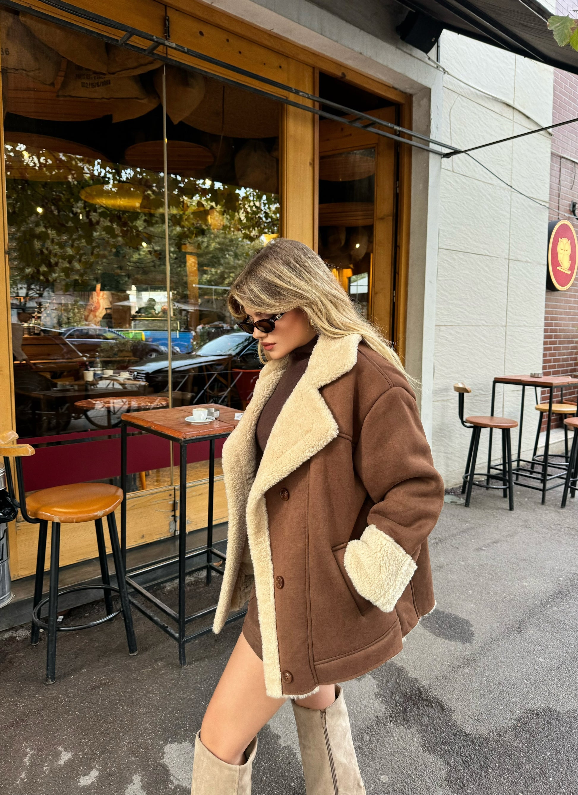 Pellush ne ngjyren kafe me kopsa ne pjesen para. Material cilesor dhe i ngrohte.Ky model unikal kombinon rehatinë dhe stilin në mënyrë perfekte!