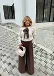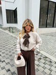 Pulover ne ngjyren bezhe, vjen me nje dizajn te vecante ne pjesen e jakes me nje shalle ne formen e fjongos. Material i bute dhe komode, lehtesishte e kombinueshme ne perditshmerin tuaj.