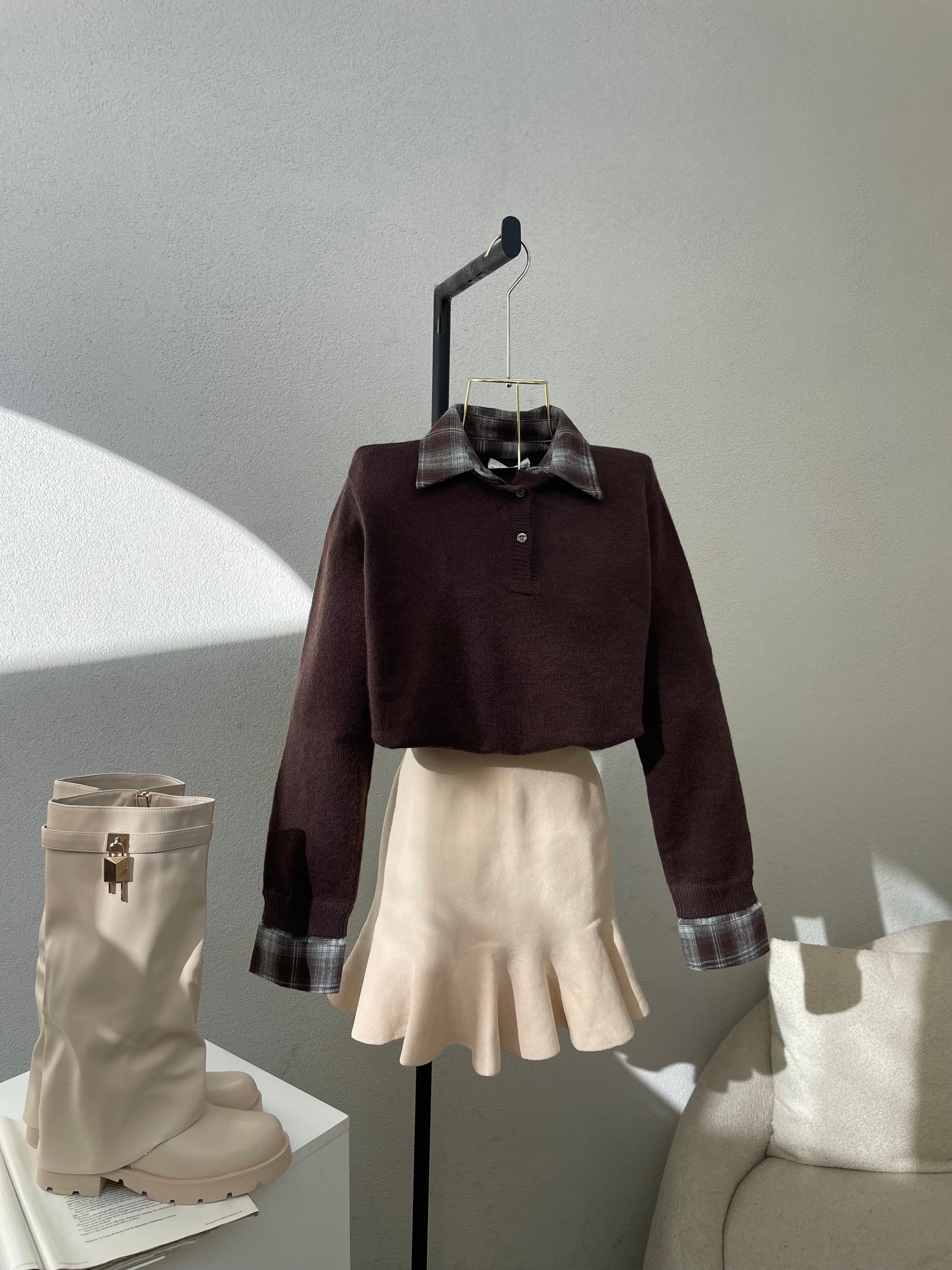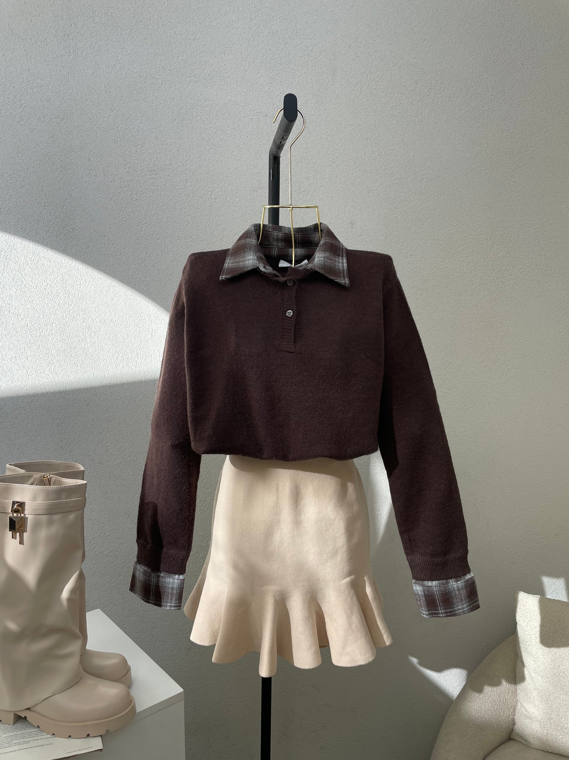 Pulover kafe me dizajn te thjeshte dhe detaje elegante këmishe me kuadrata ne qafe dhe menge. Kombinon stilin klasik me prekje moderne, perfekte per veshje te perditshme ose casual elegante.