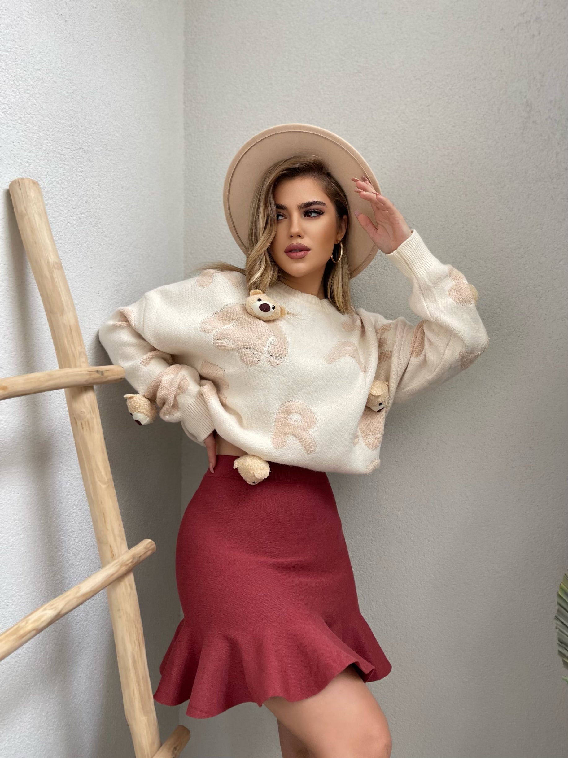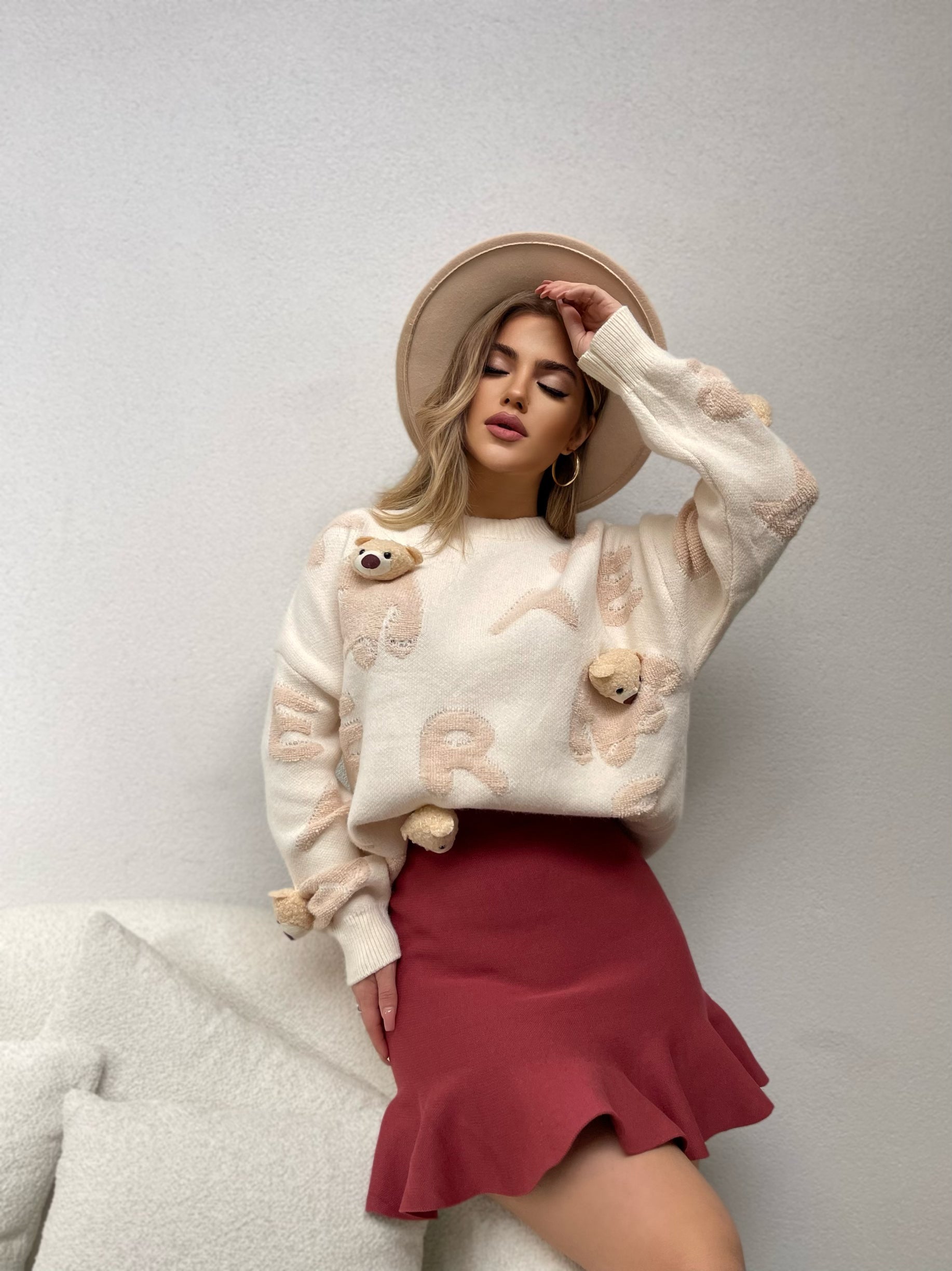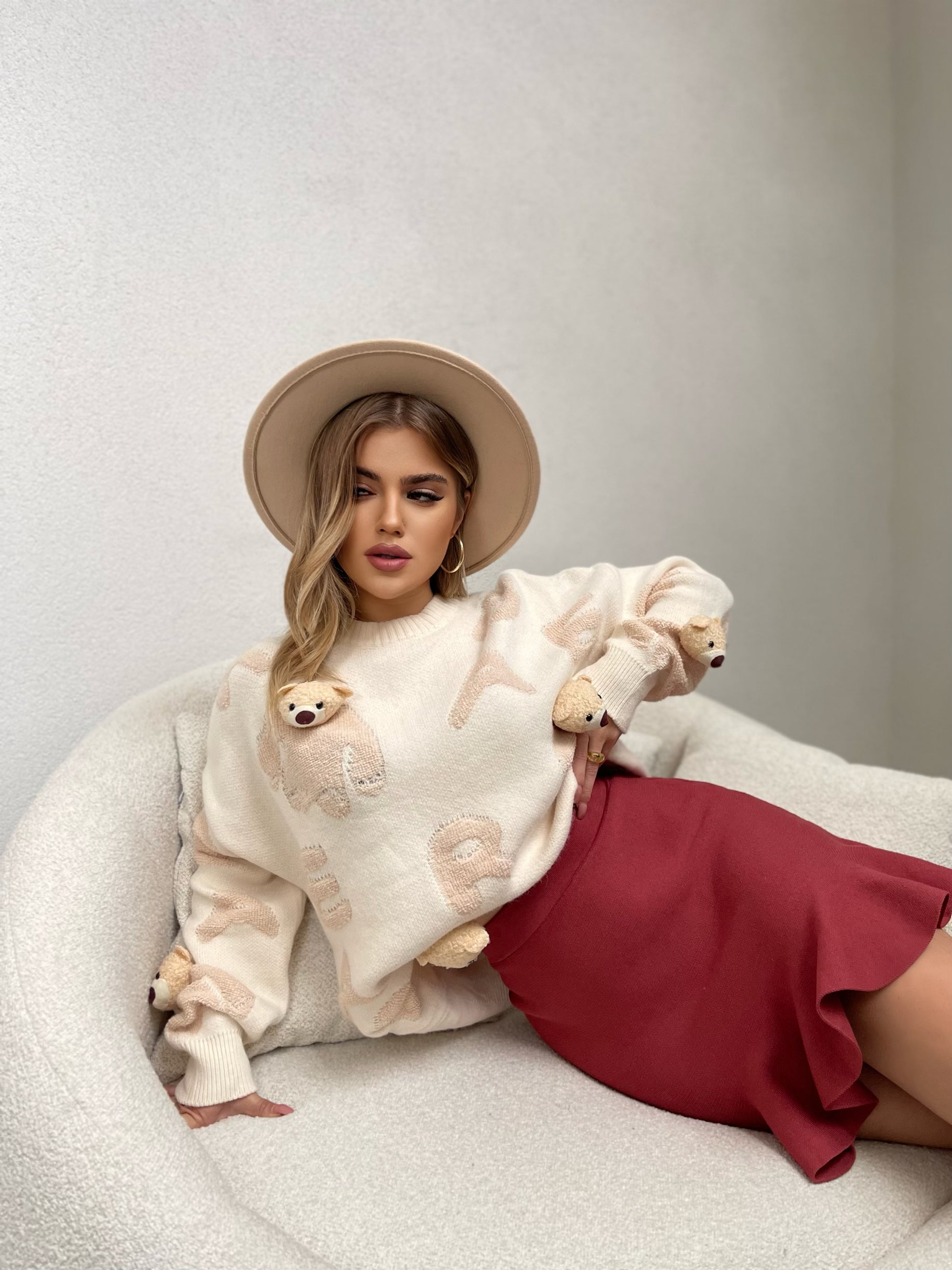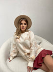 Pulover me arush me menge te gjata. Me jake rrethore me menge te gjata. Me llastik ne pjesen e duarve. Pulovra eshte ne gjatesi normale dhe eshte lehtesisht e kombinueshme.