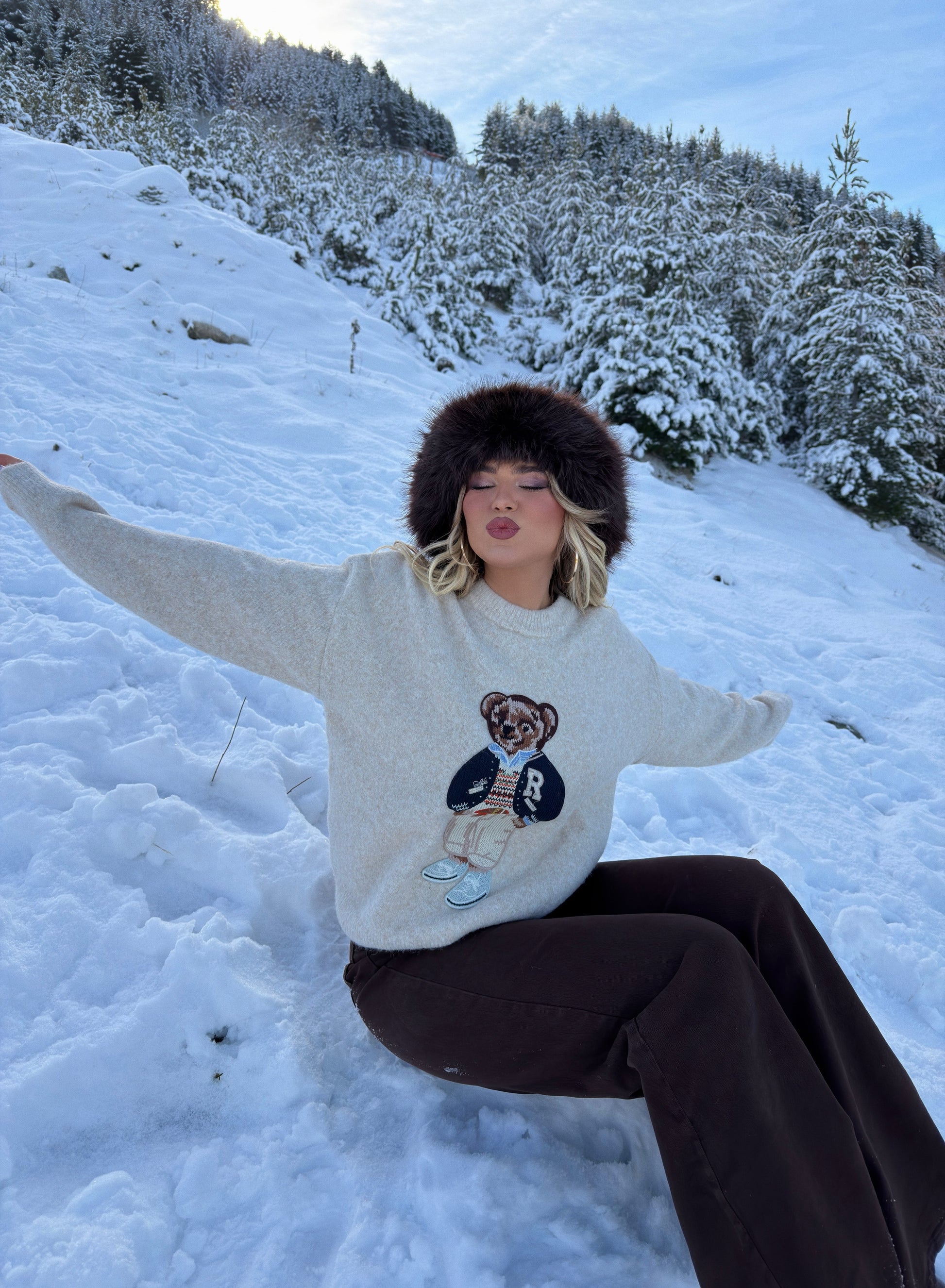 Pulover e butë dhe e ngrohtë, e zbukuruar me një figurë arushi në pjesën e përparme. Vjen në dy ngjyra elegante,kafe dhe bezhë. Ideal për ditët e ftohta dhe për një stil të këndshëm e komod.