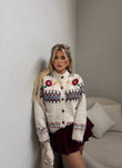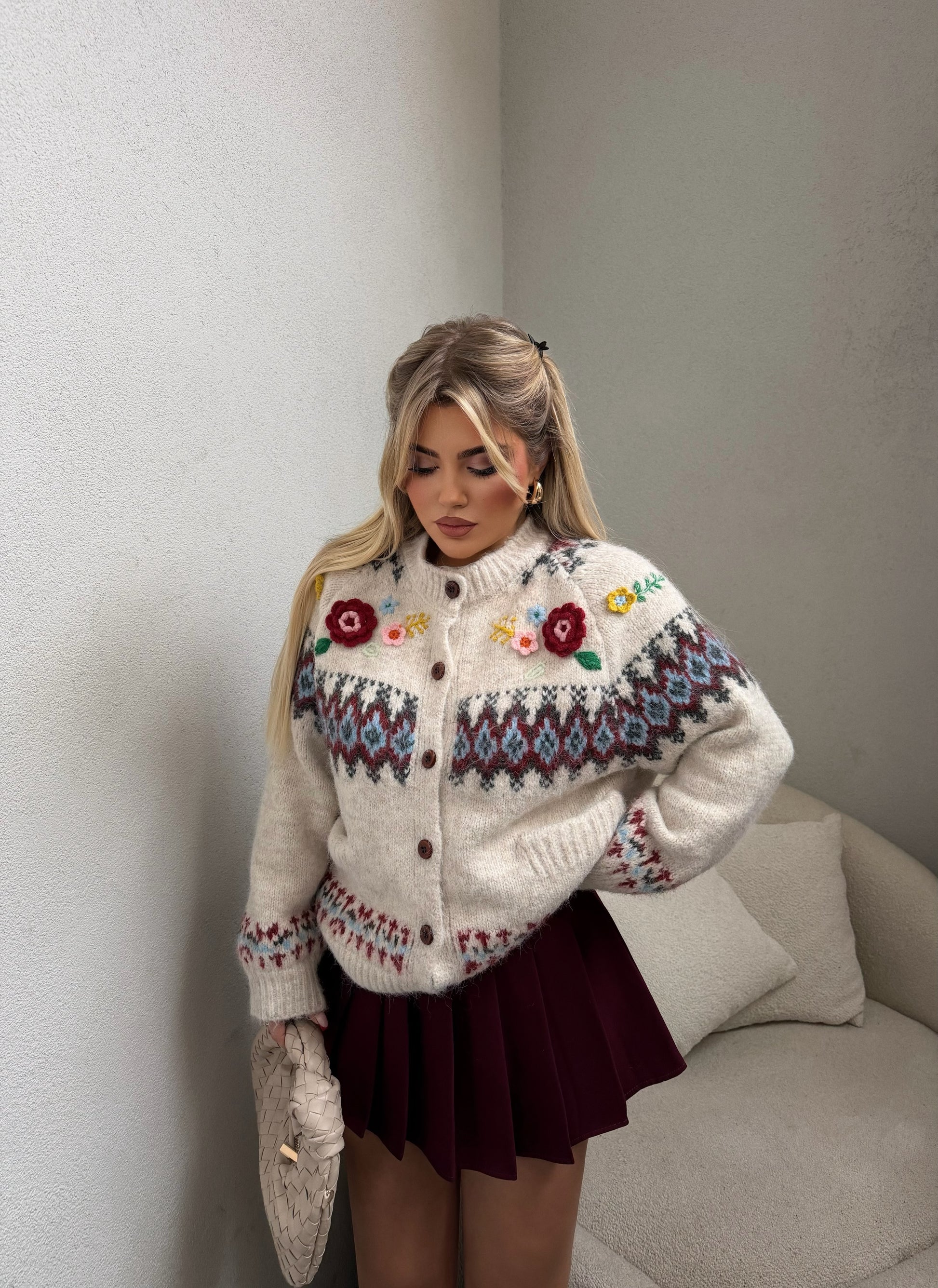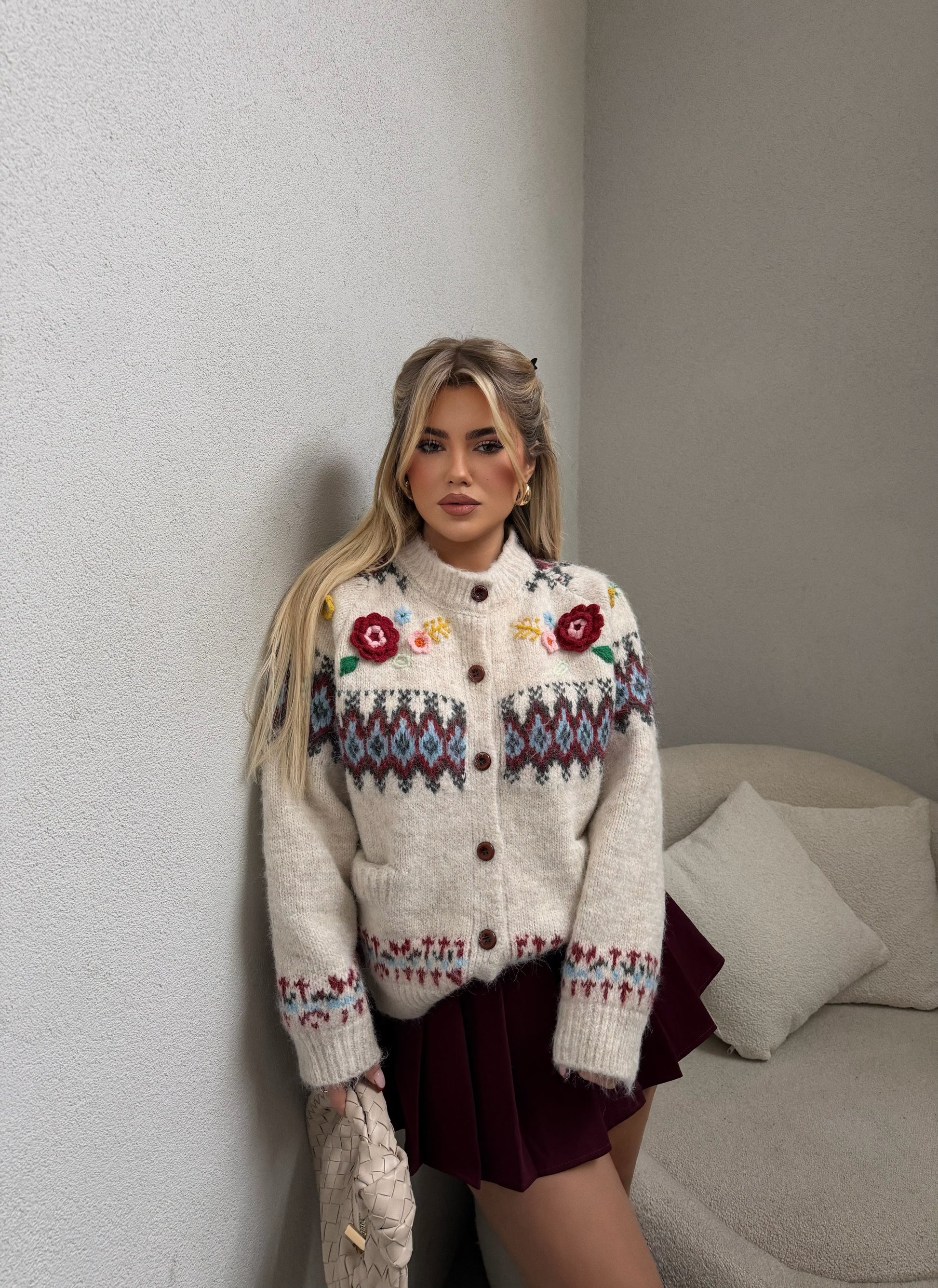 Pulovër bezhë me kopsa dhe detaje lulesh.Pulovër elegante në ngjyrë bezhë, me kopsa përpara dhe lule të kuqe në pjesën e shpatullave që i japin një prekje të veçantë. Material i butë dhe i ngrohtë, ideal për ditët e ftohta dhe kombinime të përditshme me stil.