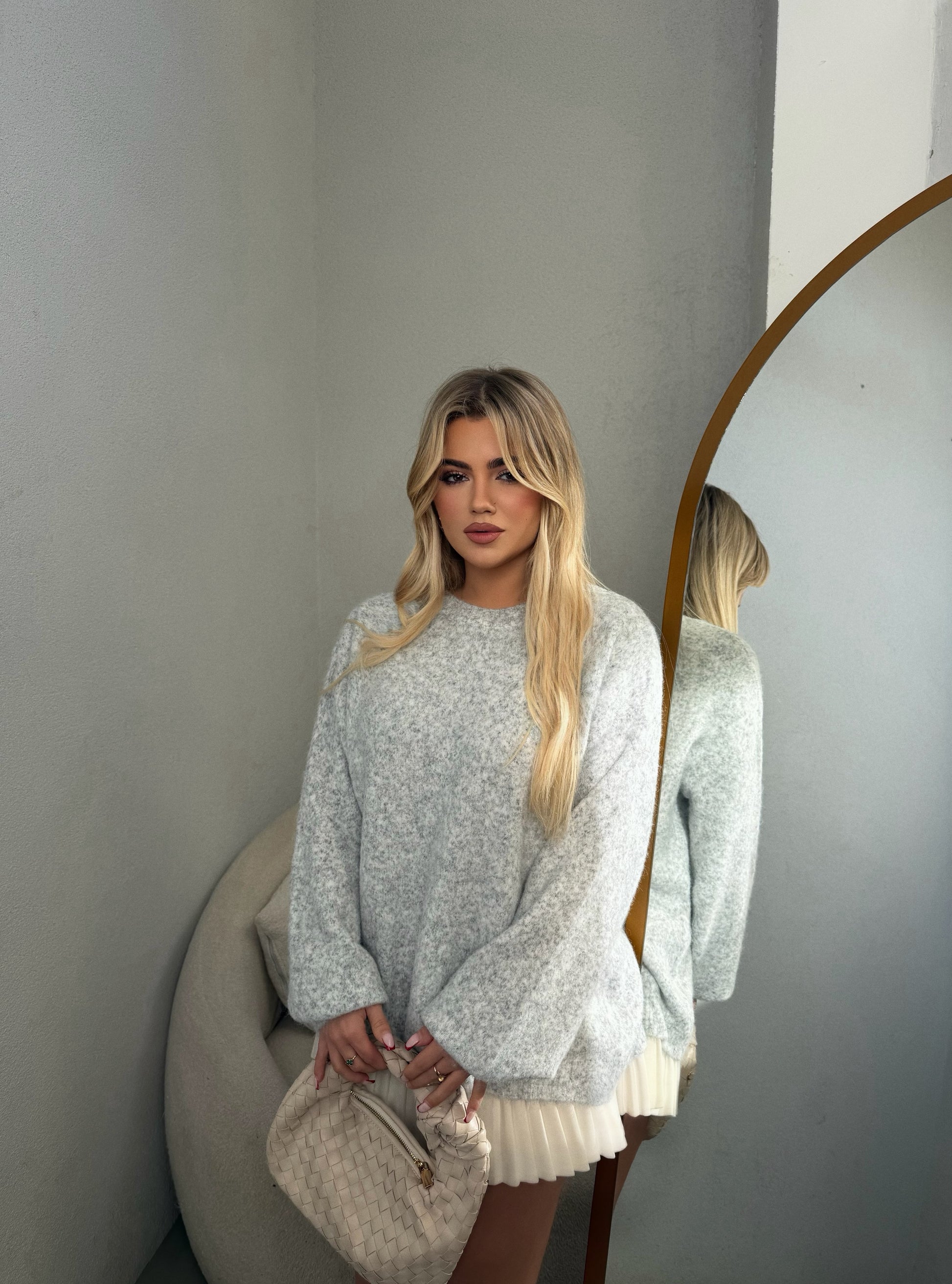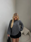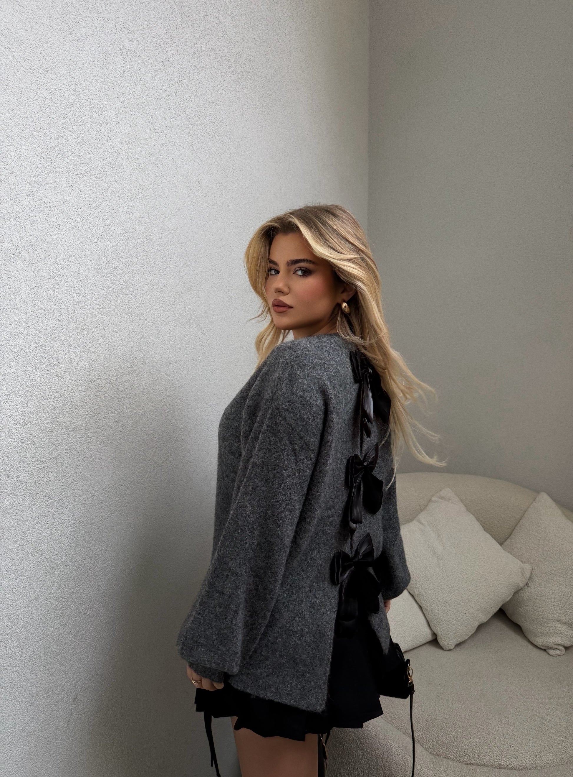 Pulover ne ngjyren gri vjen me fjongo te bardha ne pjesen prapa, material i bute dhe i ngrohte. Lehtesishte e kombinueshme.