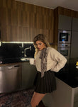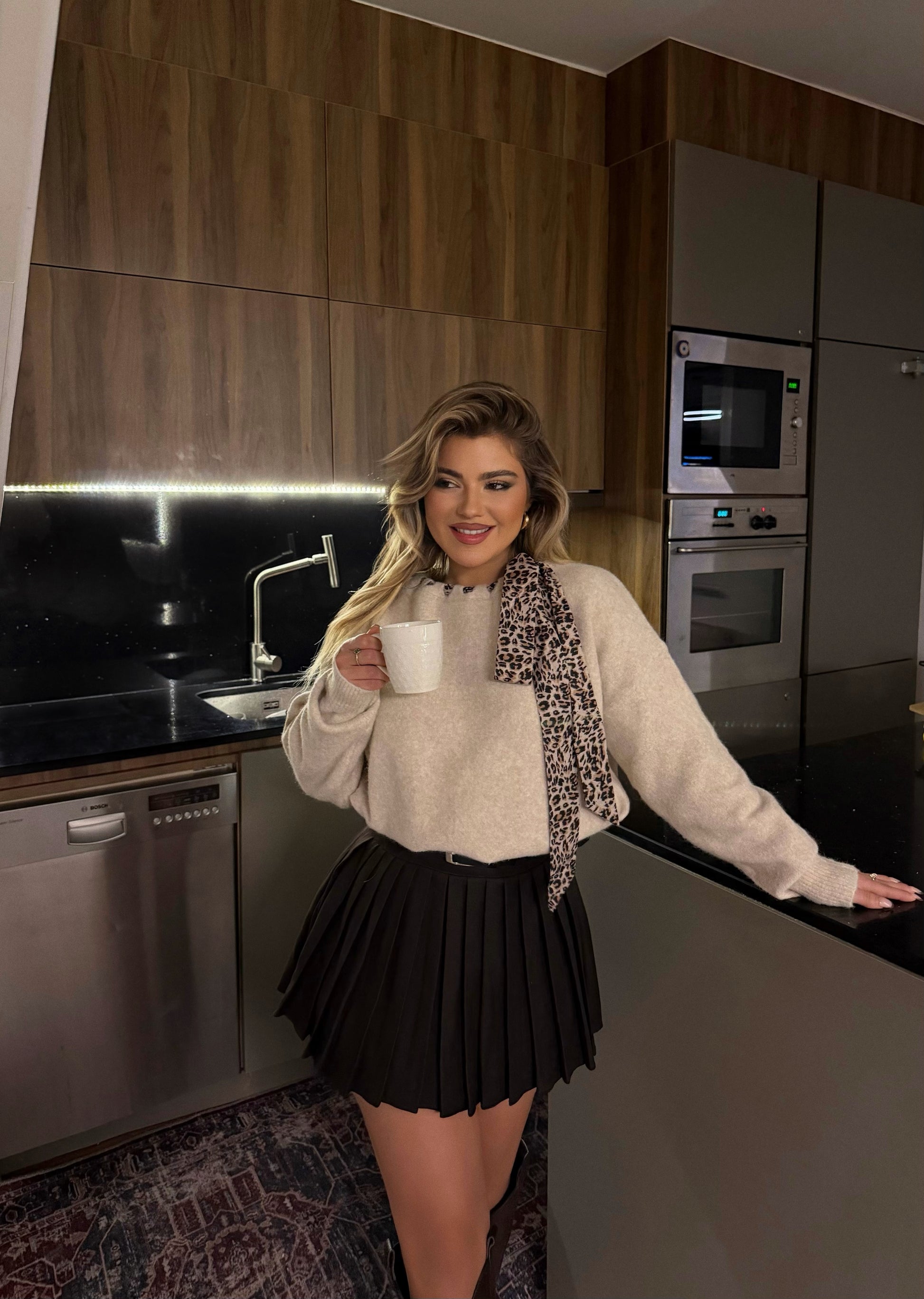 Pulover ne ngjyren bezhe. Pulovra vjen me nje dizajn te vvecante ne pjesen e qafes eshte me nje fjongo ne ngjyren kafe leopard. Material i bute dhe i ngrohte, lehtesishte e kombinueshme.