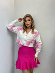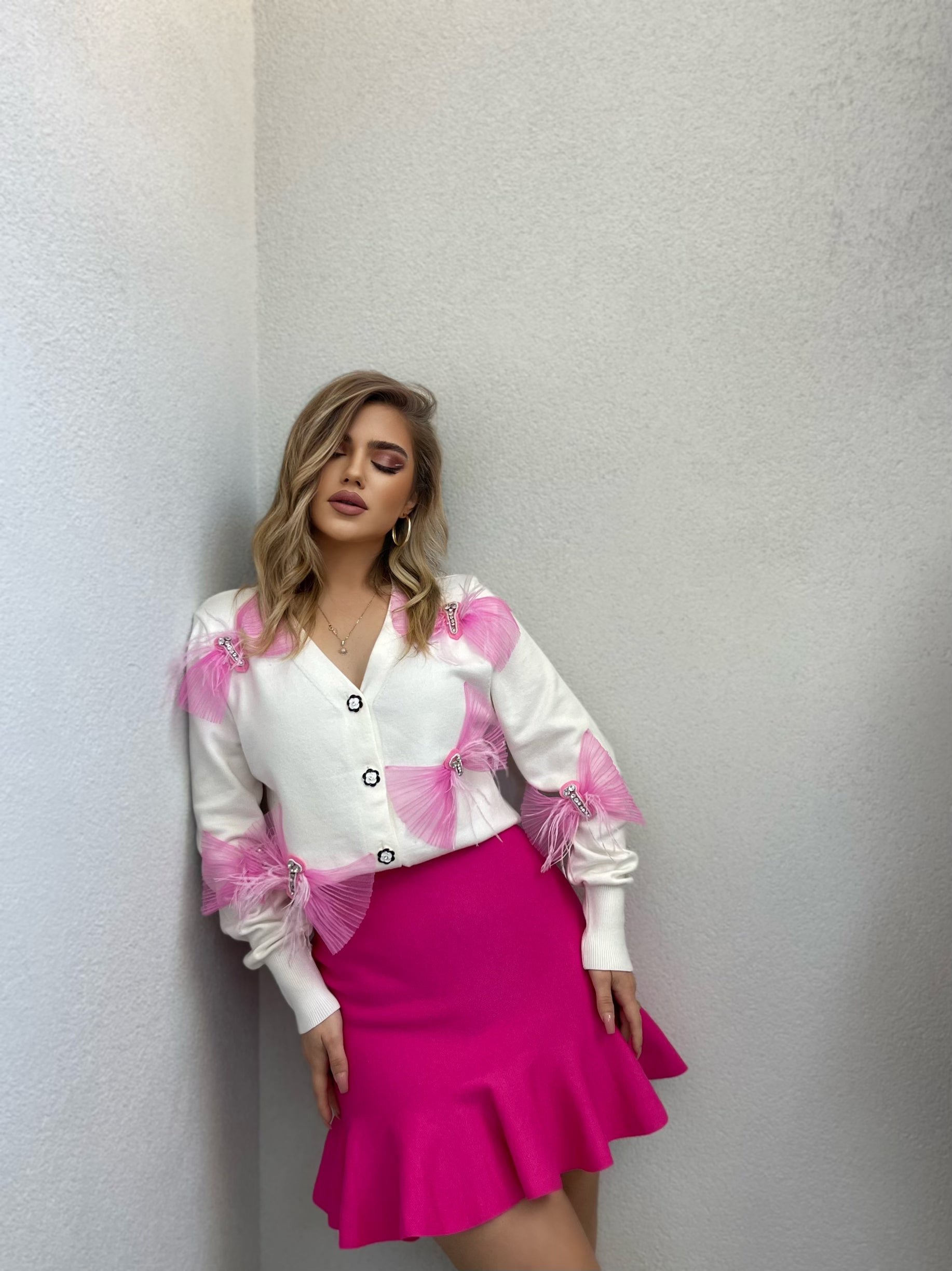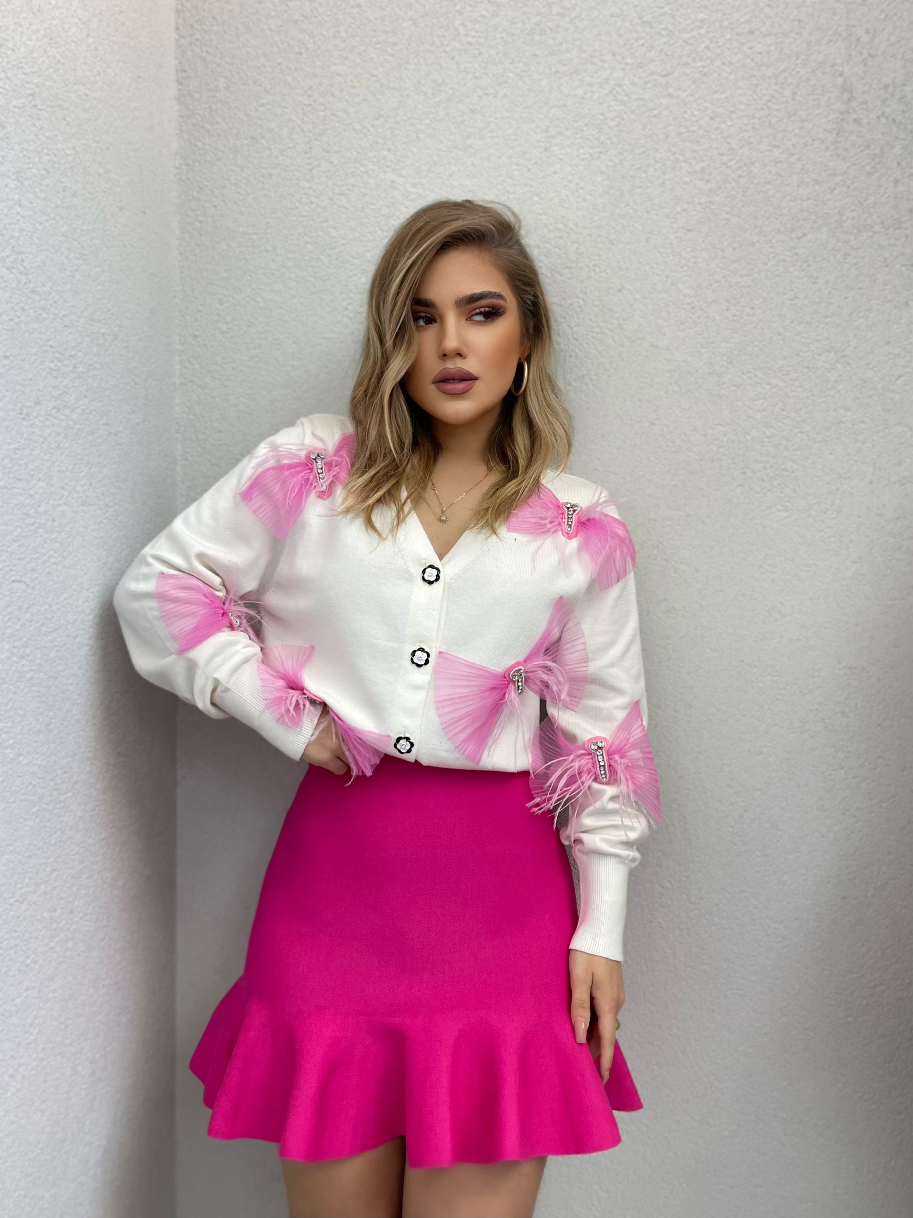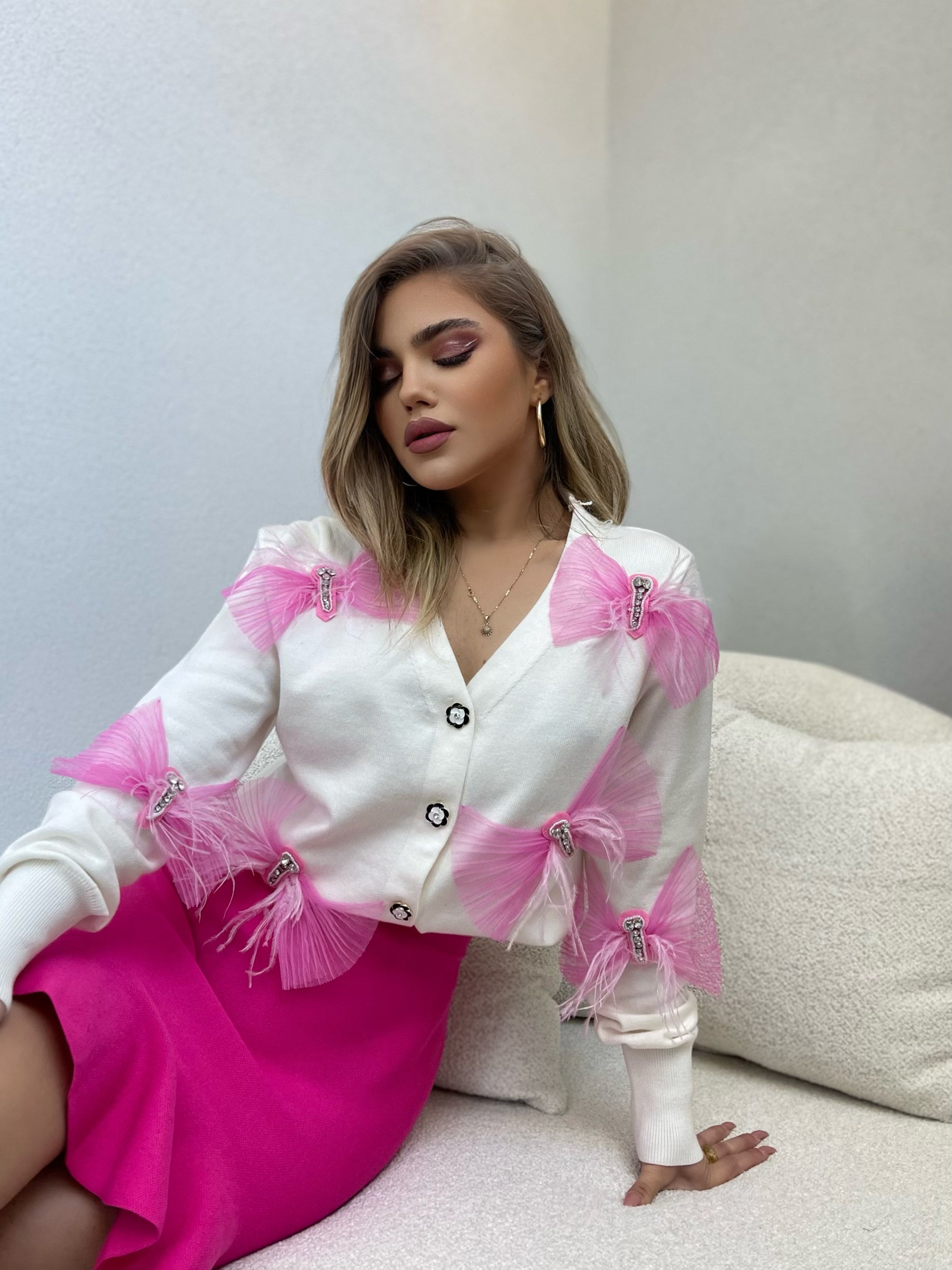 Pulover me jake ne form V-je me mnege te gjata me fjongo roze ne pjesen e perparme. Mberthimi behet me kopsa ne pjesen e perparme. Teper stil dhe e figurshme.