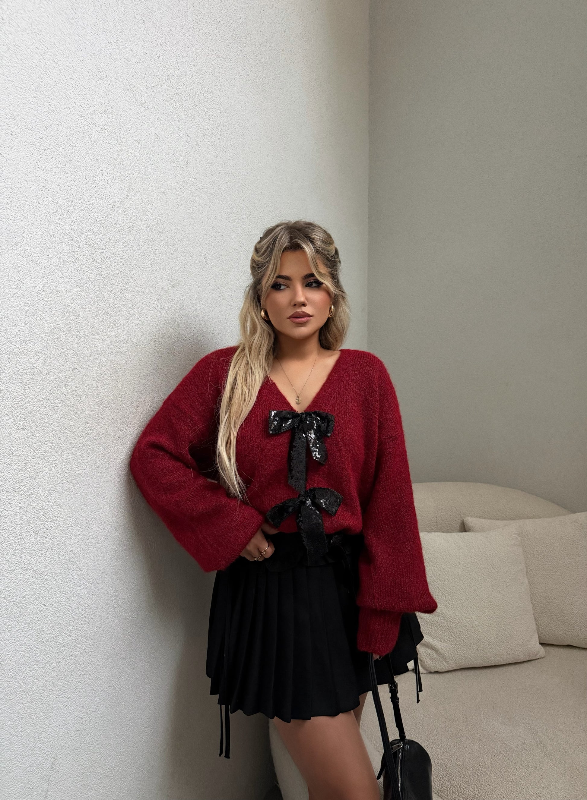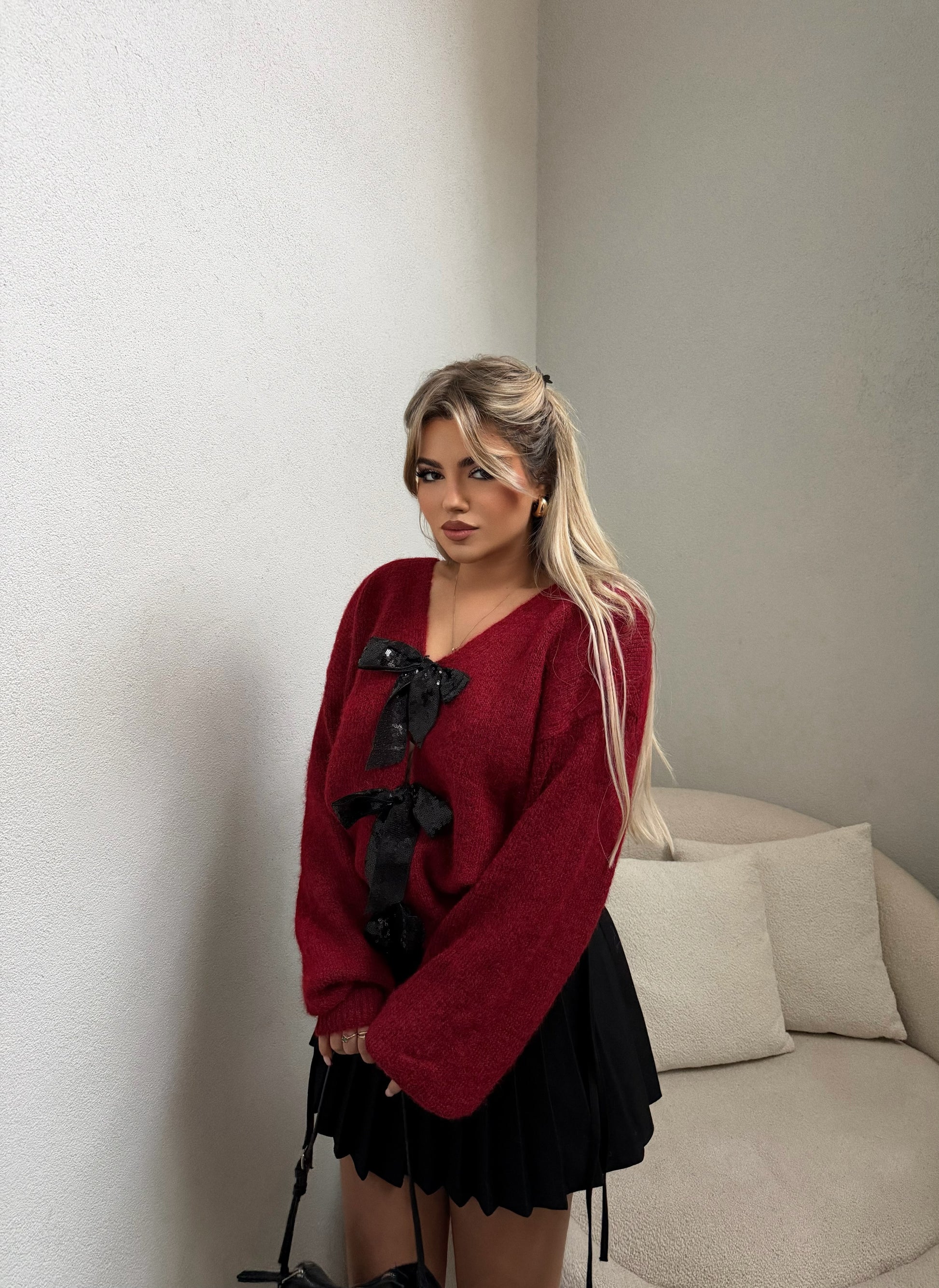 Pulover vishnje me fjongo ne ngjyrene zeze. Material shume i bute dhe i ngrohte. Lehtesishte e kombinueshem per raste te vecanta dhe ne perditshmerin tuaj.