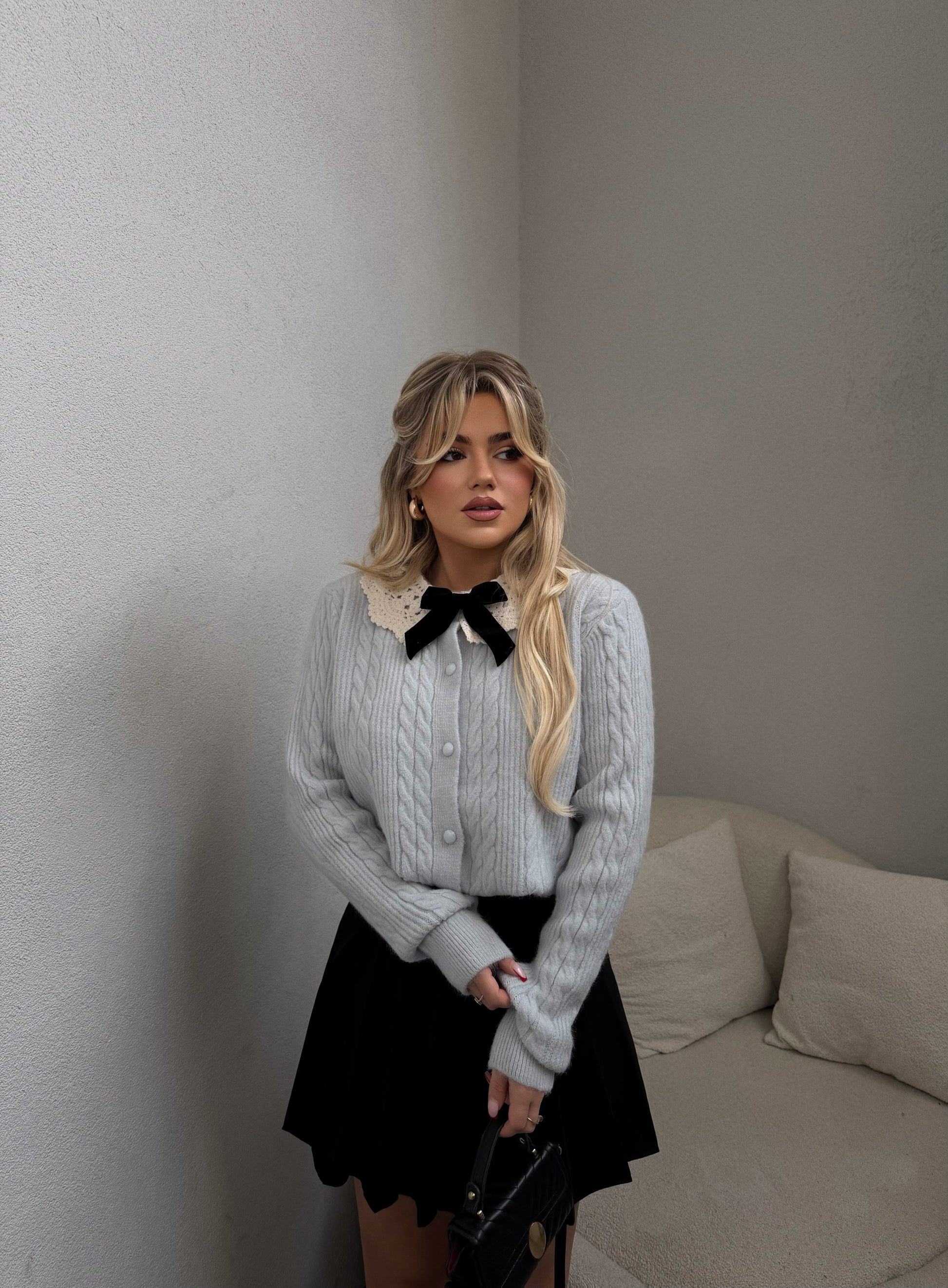 Pulover ne ngjyren bojeqielli. Pulovra vjen me nje dizajn te vecant me jaken e bardhe dhe nje fjongo te vogel ne ngjyren e zeze. Material i bute dhe i ngrohte. Perfekte per ditet e ftohta.