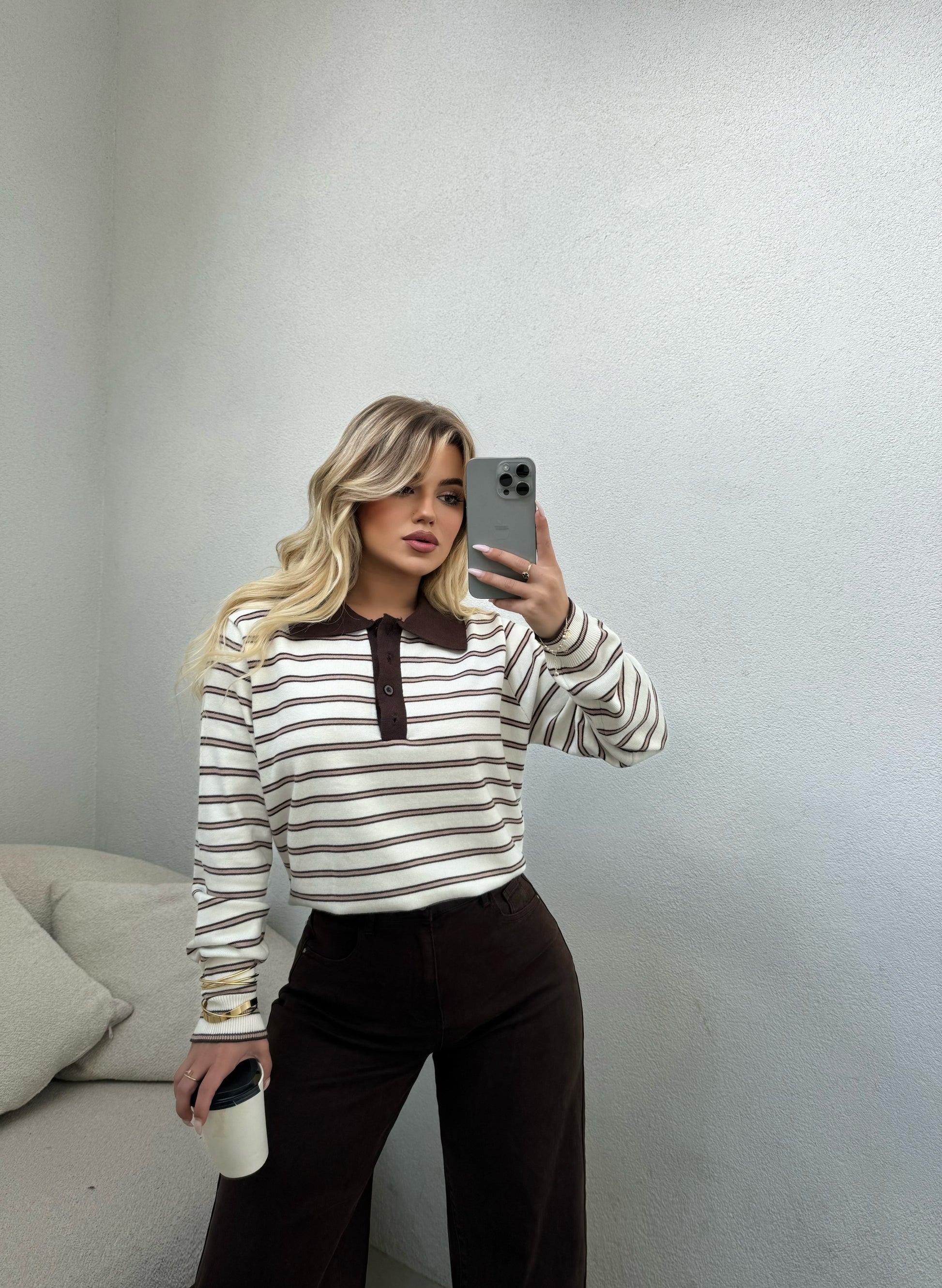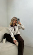 Pulover me vija kafe dhe jake kemishe. Material i plote, shume i bute dhe komod ne trup. Teper e vecante dhe stil.