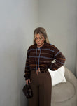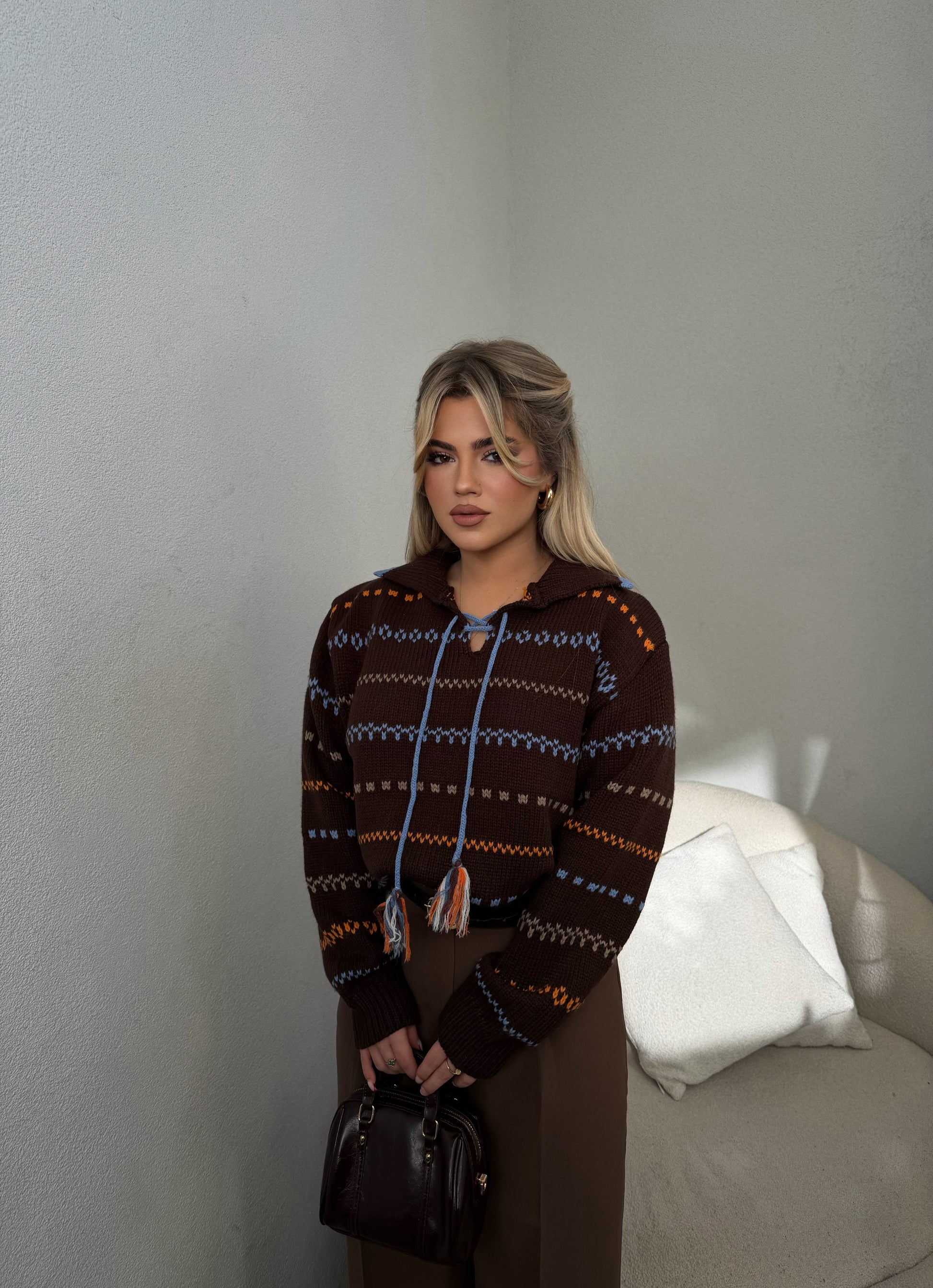 Pulover ne ngjyren kafe, vjen me nje dizajn teper te vecante dhe ne pjesen jakes e ka ne kemishe, pulovera vjen me disa viza ne ngjyren blu, portokalli dhe kafe. Teper stil.