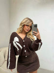 Pulover me kopsa dhe qendisje fjongo ne ngjyren kafe. Vjen ne material te plote, shume te ngrohte. Shume e vecante dhe e kombinueshme.