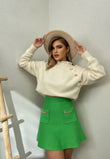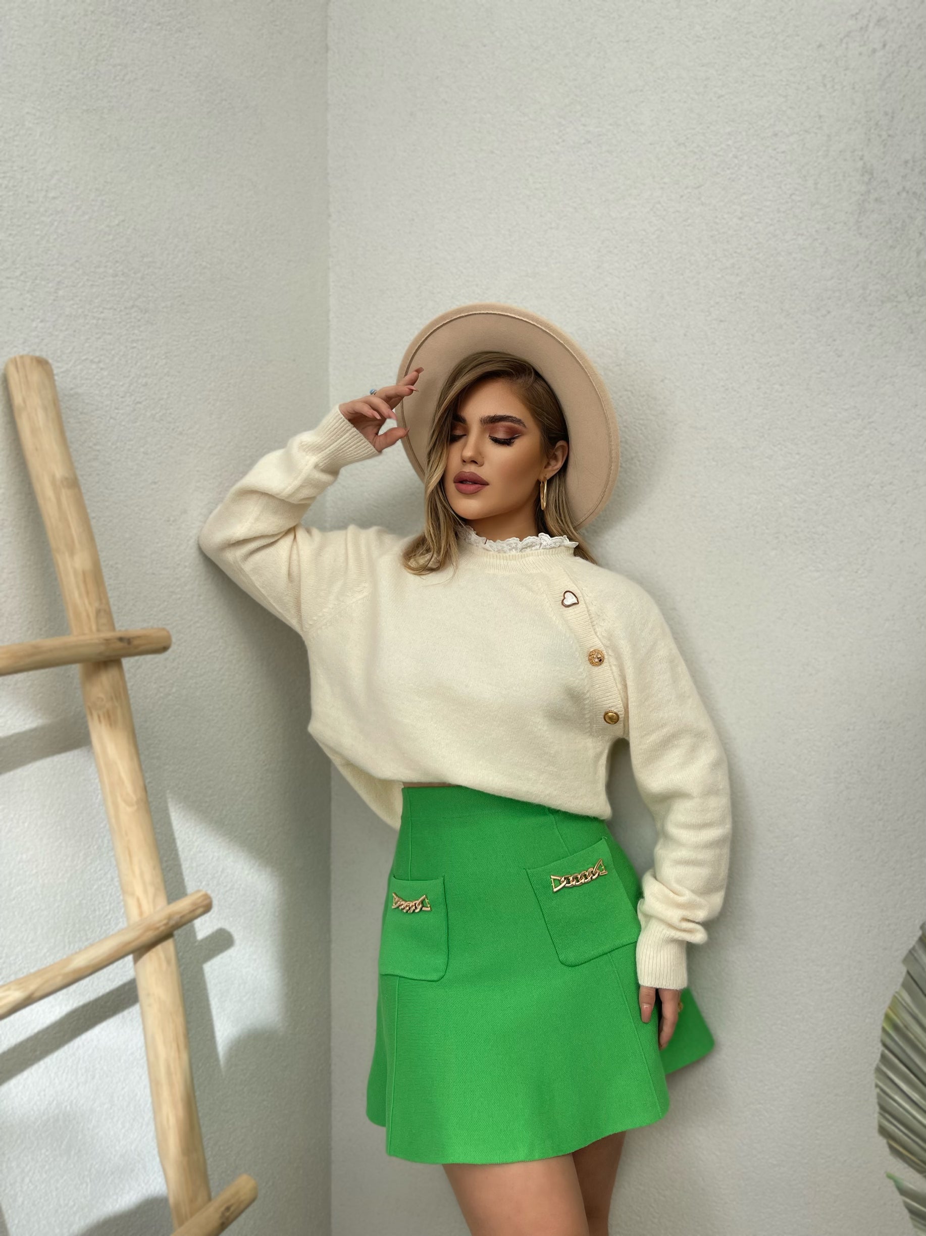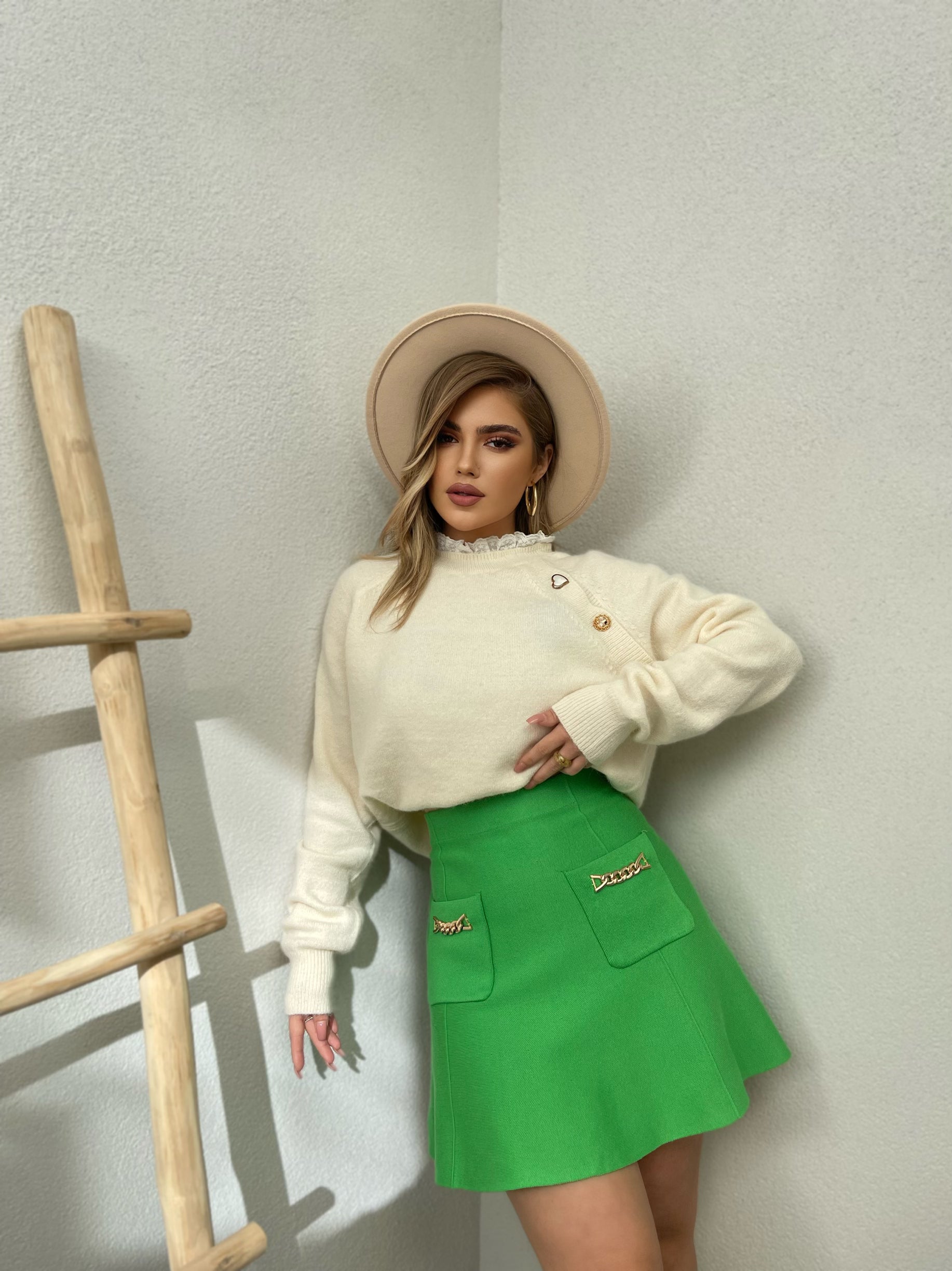 Pulover me menge te gjata me kopsa ne pjesen e supit me jake dantelle. Menget jane me doreza ne pjesen e fundit. Pulovra ka gjatesi normale dhe eshte e kombinueshme.
