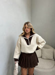 Pulover ne ngjyren bezhe me dizajn te thjeshte dhe detaje te vecanta ne pjesen e qafes dhe ne menget e saj ne ngjyren kafe. Lehtesishte e kombinueshme.