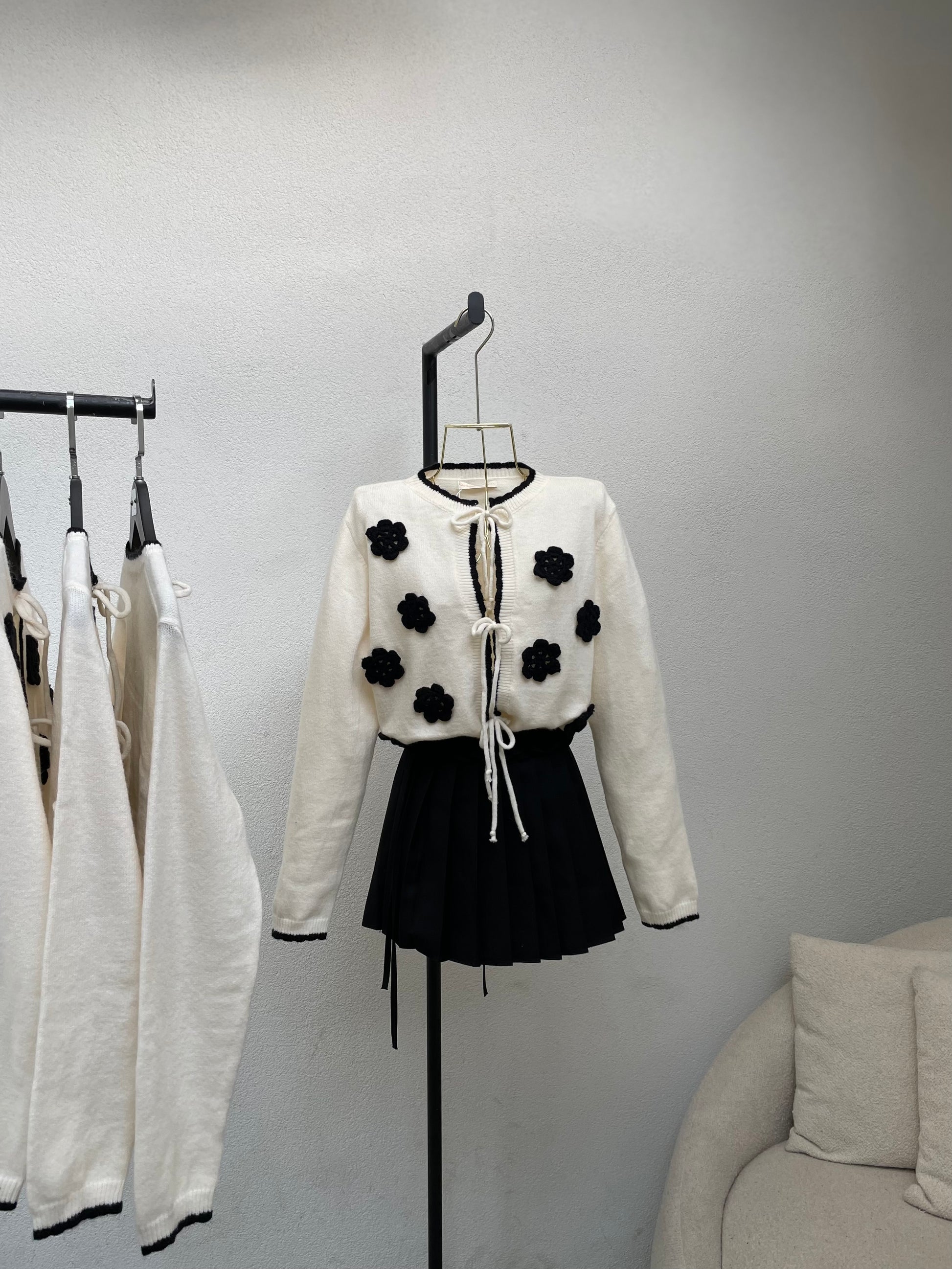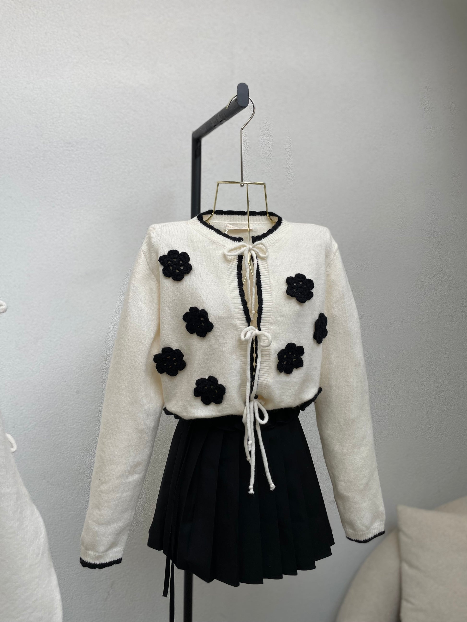 Pulover ne ngjyren bezhe me lidhje fjongo dhe lule te zeza. Vjen ne material te plote , shume e ngrohte. Teper e vecante dhe e kombinueshme.