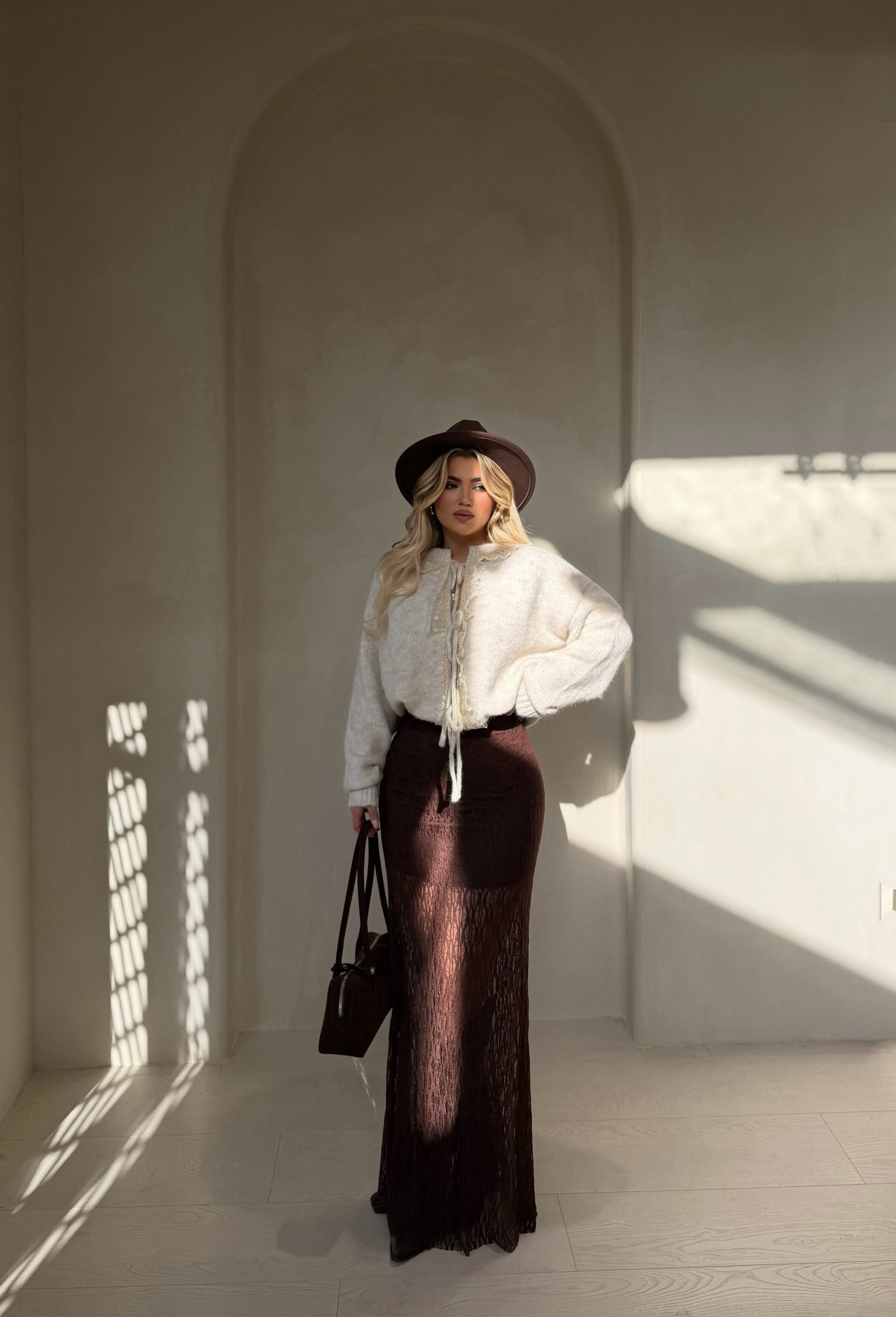 Pulovër bezhë me lidhje përpara, e butë dhe e rehatshëm. Stil elegant dhe e pershtatshem për kombinime të përditshme ose raste speciale.