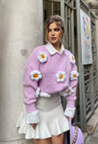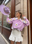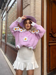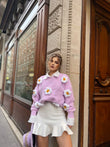 Pulover me ngjyre pastel me lule ne pjesen e mengeve dhe ne pjesen e perparme. Ne pjesen e mengeve ne fund jane me doreza. Pulovra ka gjatesi normale dhe eshte teper e kombinueshme.