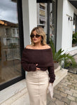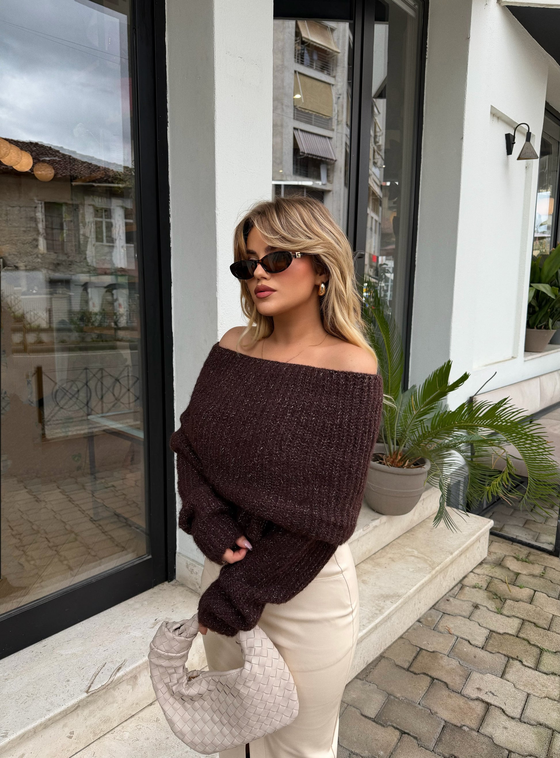 Pulover në ngjyrë kafe me supet jashtë, model modern dhe i rehatshëm, i përshtatshëm për veshje të përditshme dhe kombinime stilore.