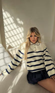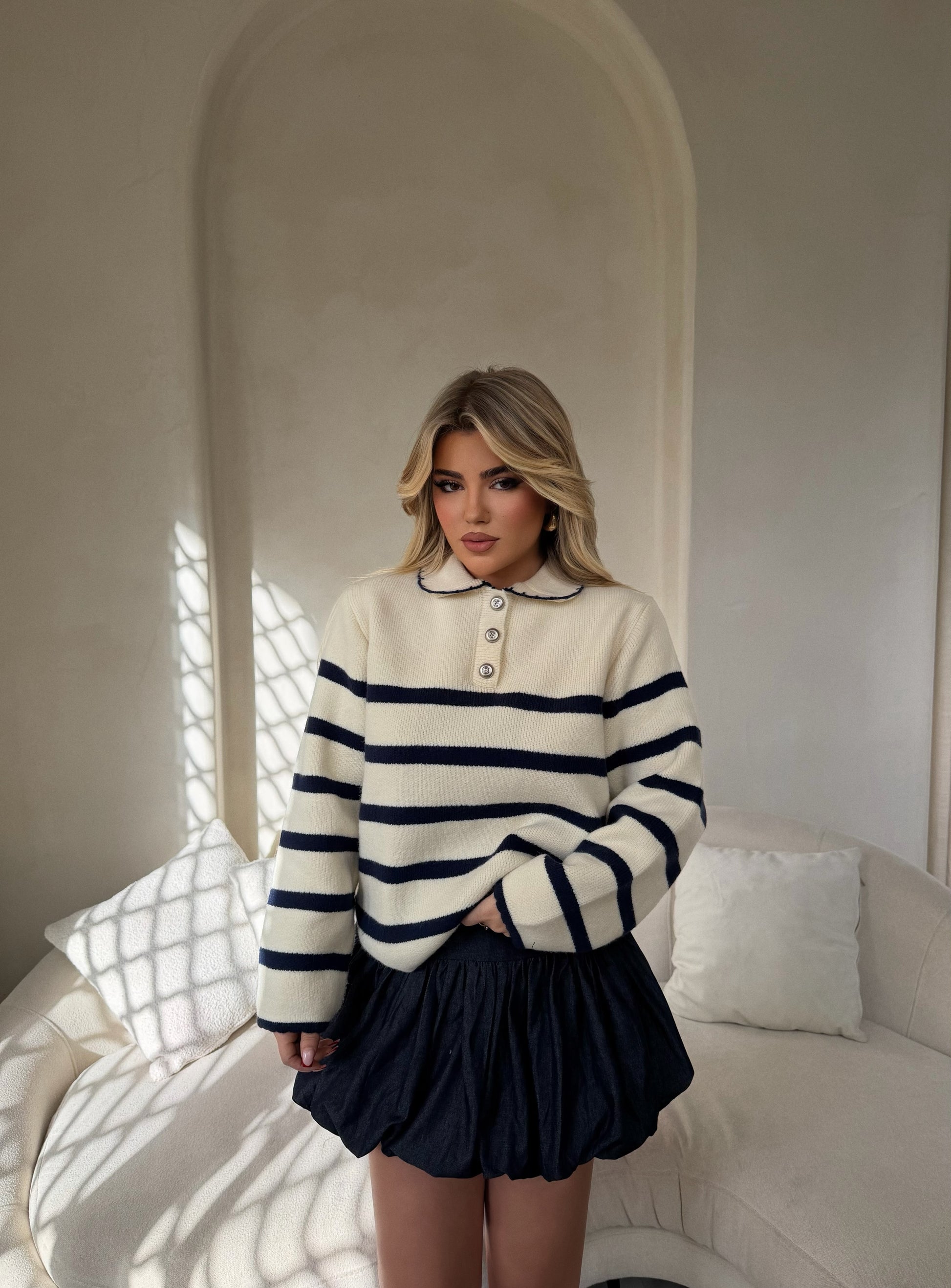 Pulover ne ngjyren bezhe,vjen me dizajn me bija ne ngjyren blu eshte e paisur me 3 kopsa para. Lehtesishte e kombinueshme.