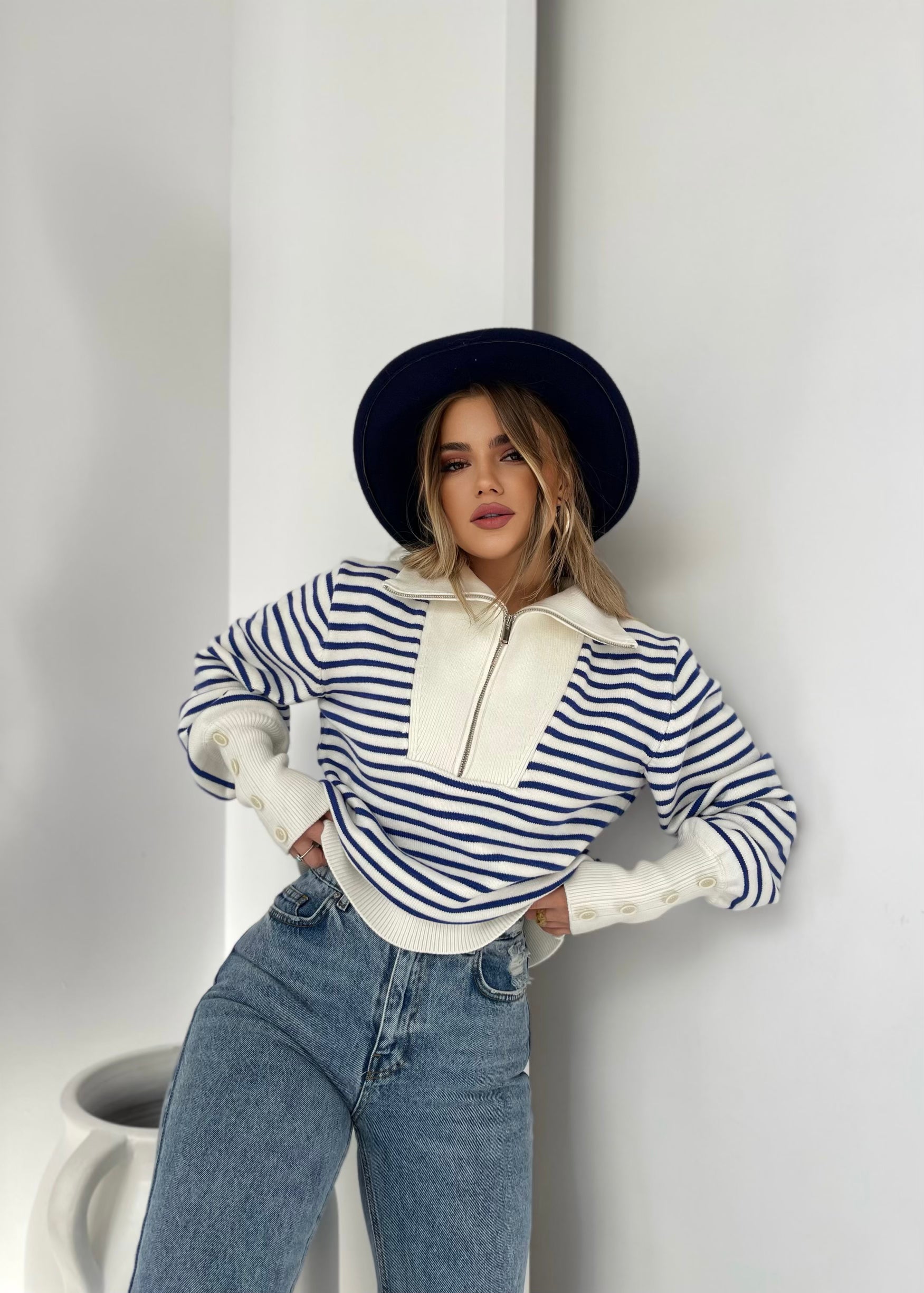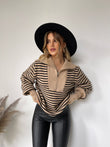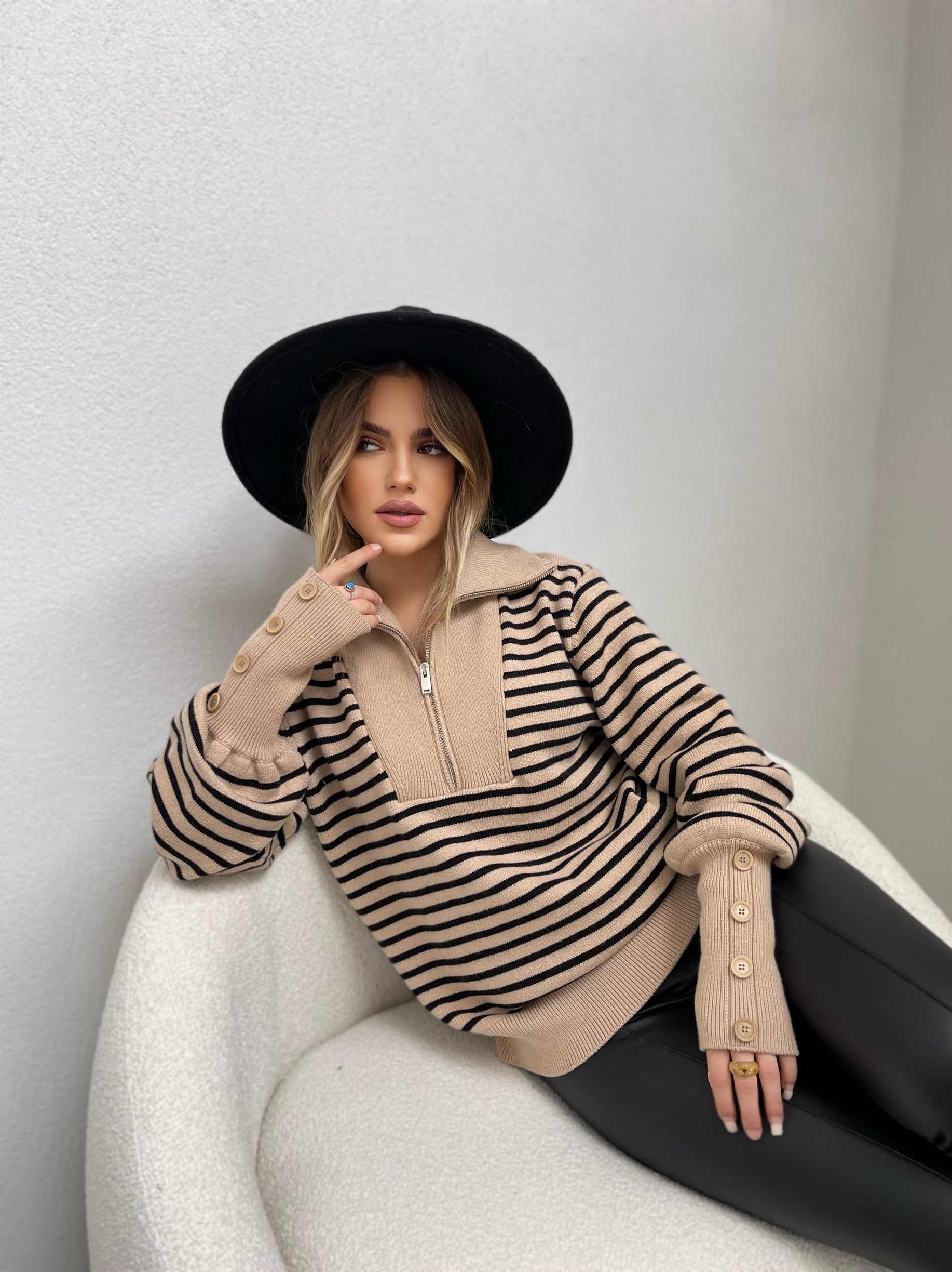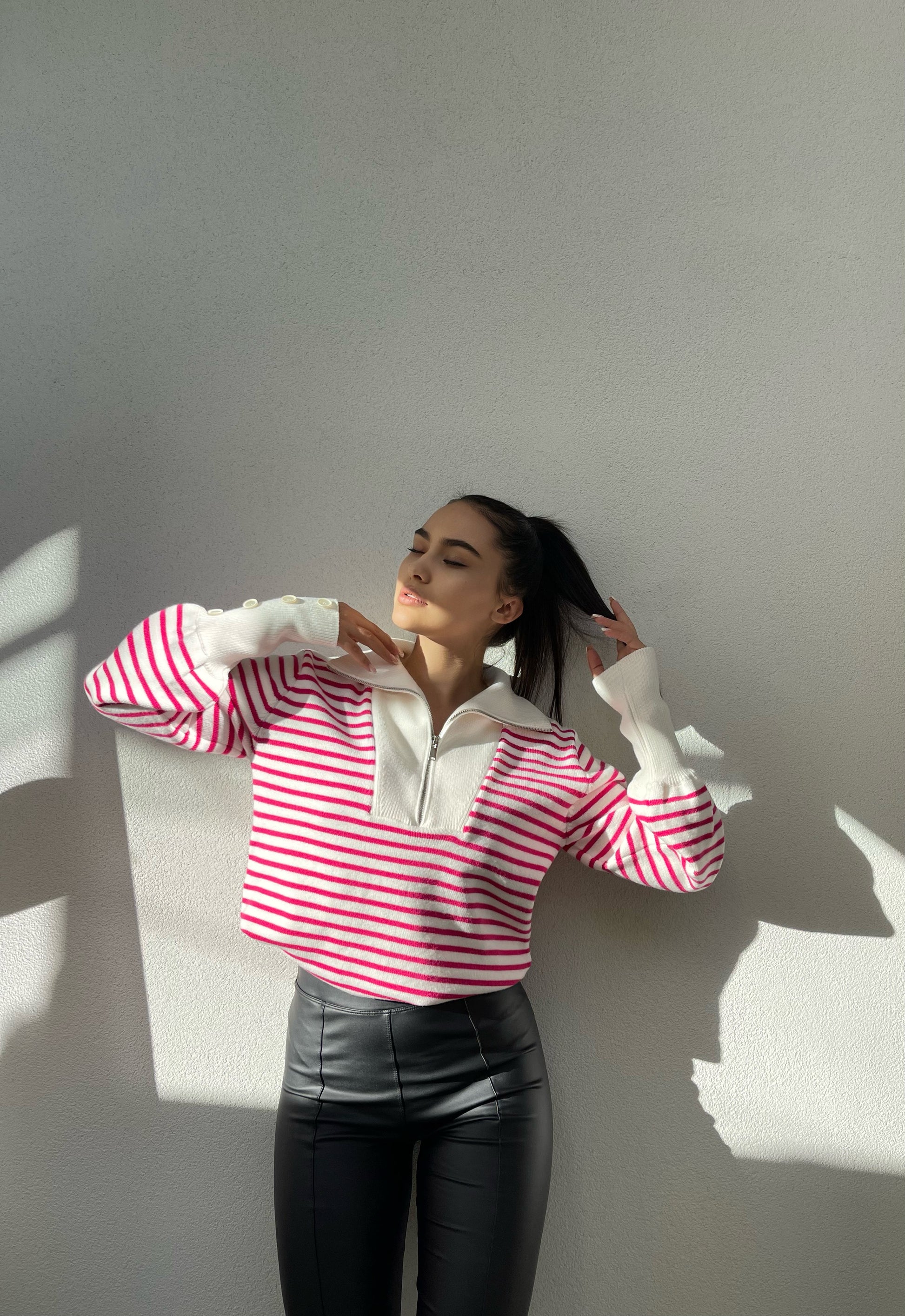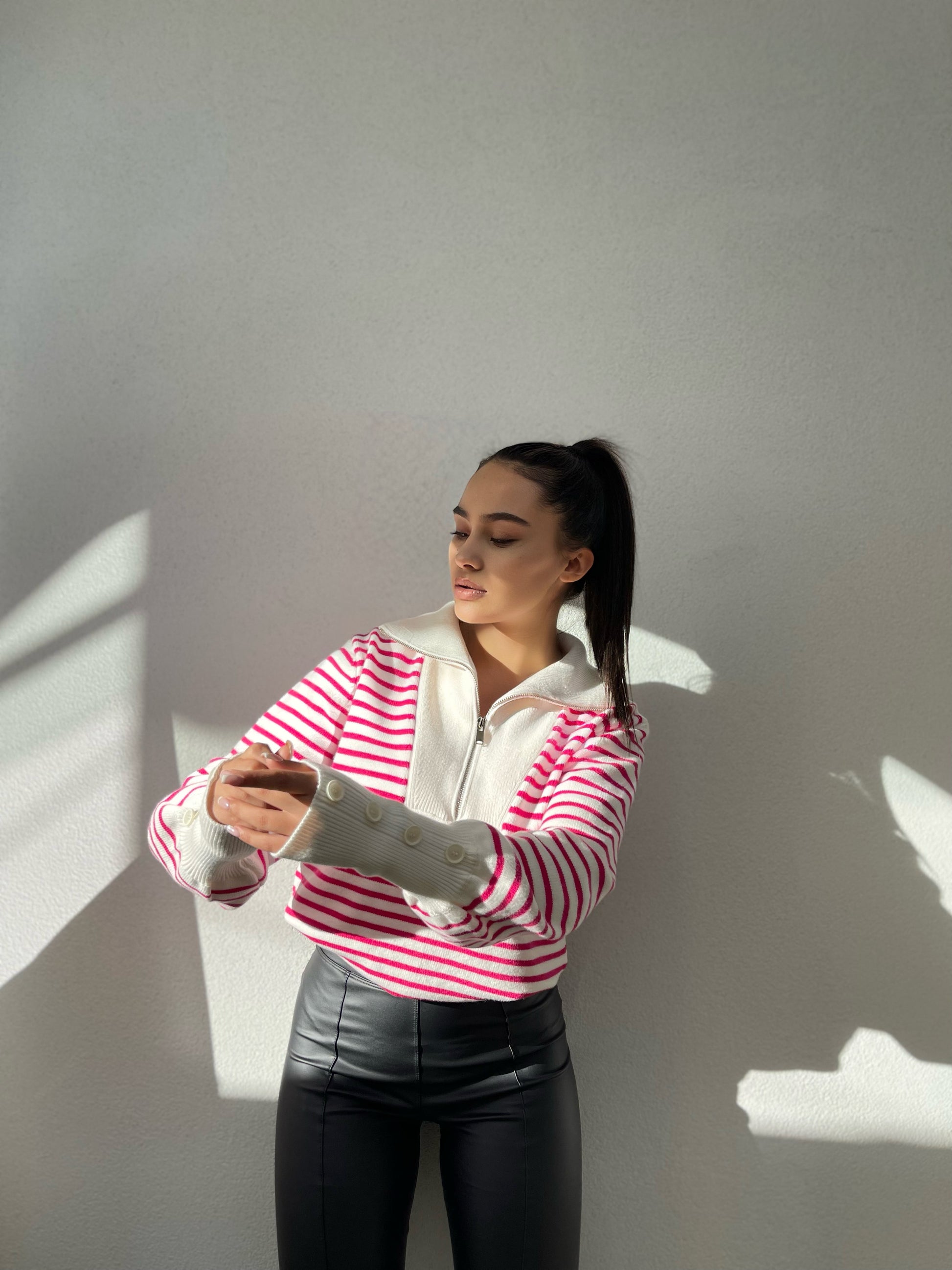 Pulover me viza me menge te gjata. Me kopsa ne pjesen e fundit te mengeve. Me jake te larte dhe zinxhir. Modeli vjene ne tri ngjyra: viza roze, viza blu dhe viza te zeza.
