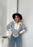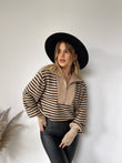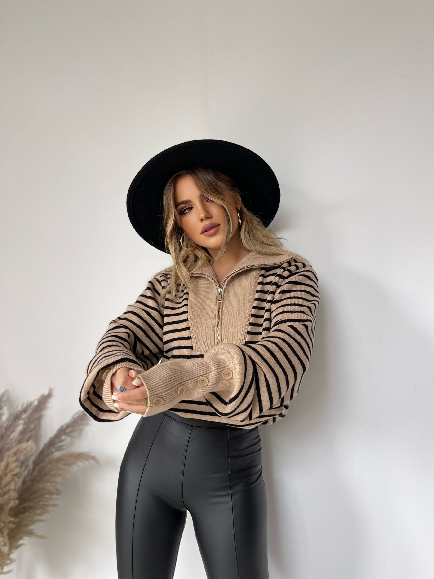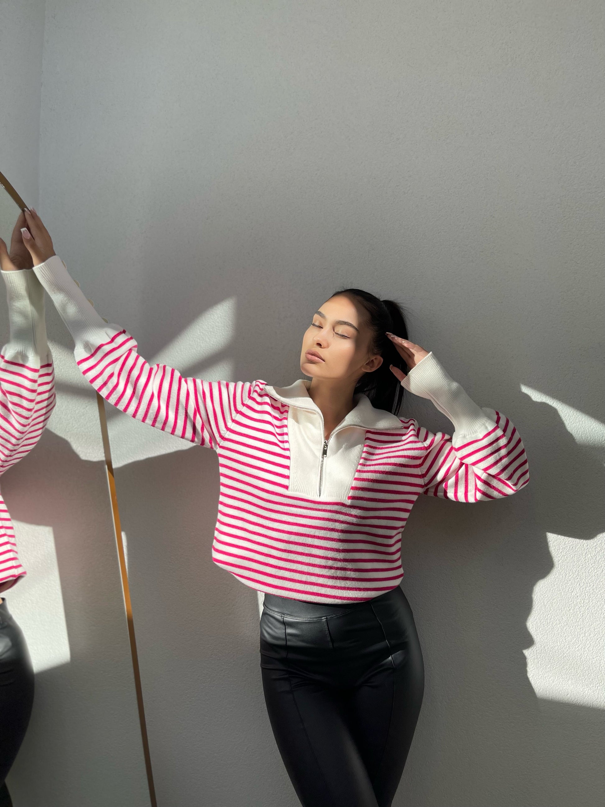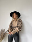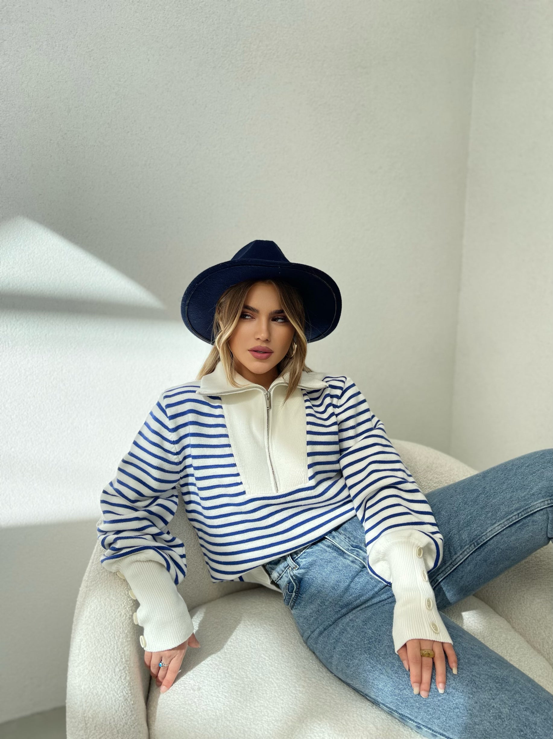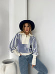 Pulover me viza me menge te gjata. Me kopsa ne pjesen e fundit te mengeve. Me jake te larte dhe zinxhir. Modeli vjene ne tri ngjyra: viza roze, viza blu dhe viza te zeza.
