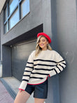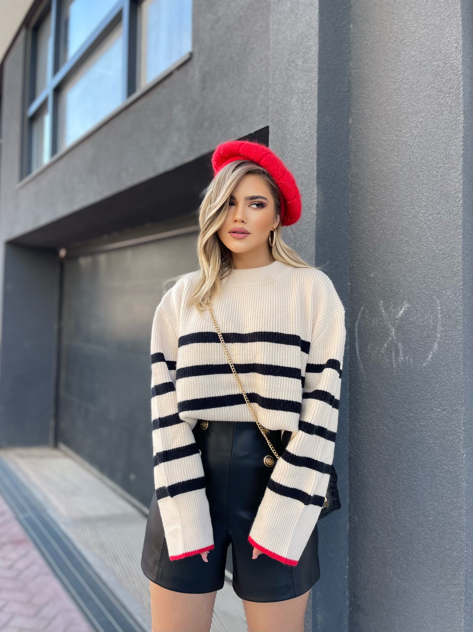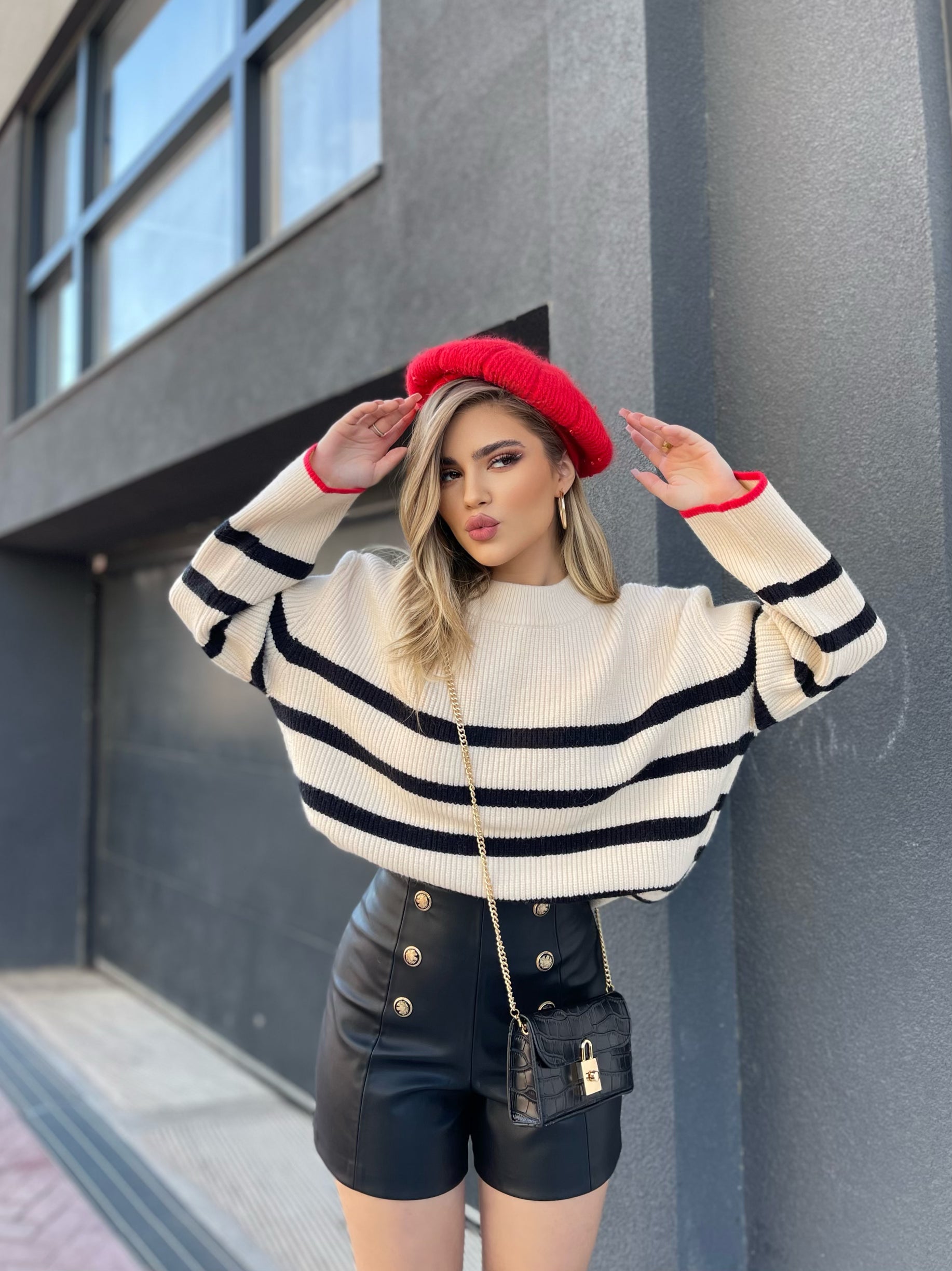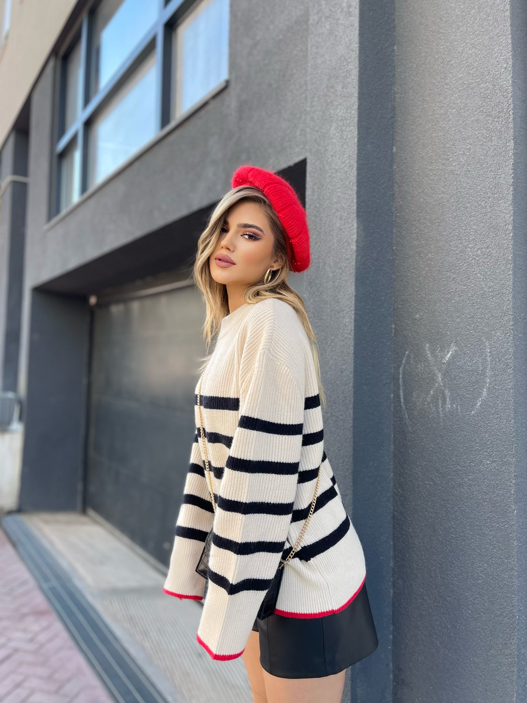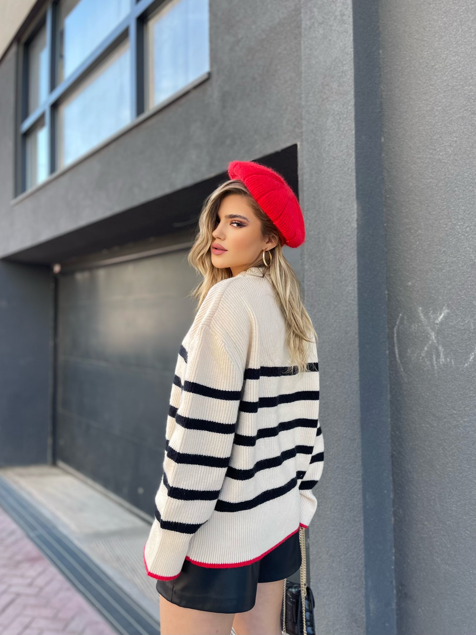 Pulover bezhe me viza te zeza. Me shirit ne ngjyre te kuqe ne pjesen fundore dhe ne pjesen e mengeve. E bute, e ngrohte dhe shume e rehatshme.