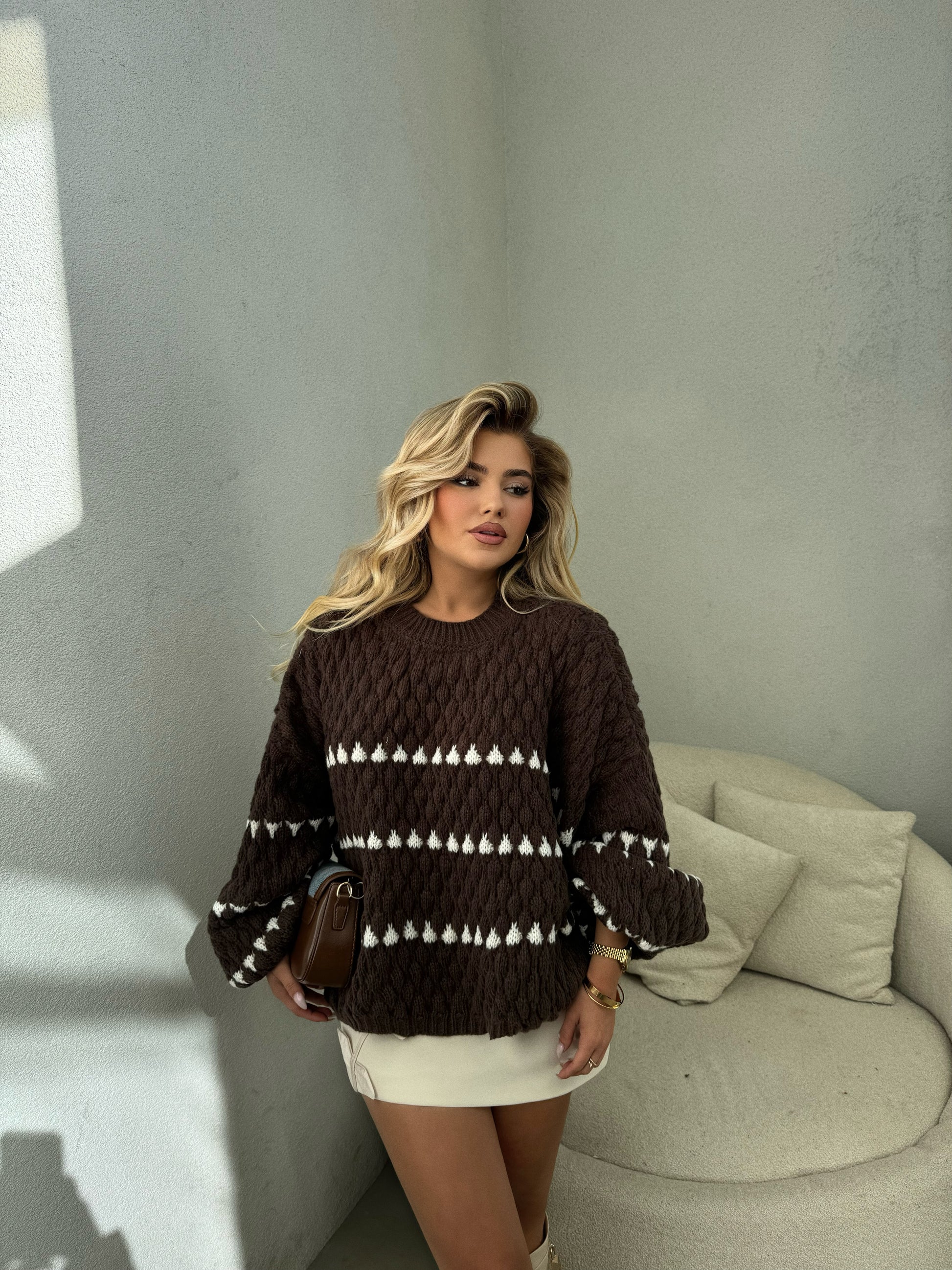 Pulover ne ngjyren kafe, vjen me nje dizajn teper te vecant. Materiali i saj eshte i bute dhe i ngrohte. Lehtesishte e kombinueshme ne perditshmerin tuaj.