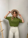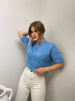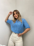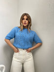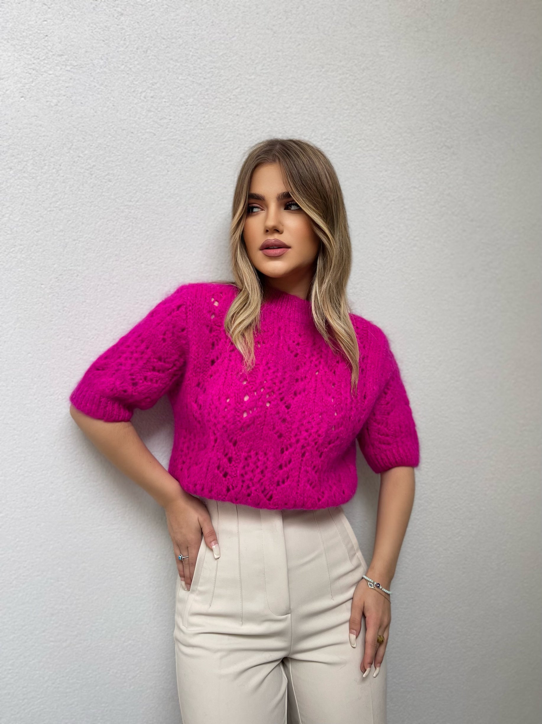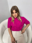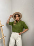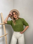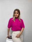 Pulover punim me grep me menge te shkurtra. Me pjes llastiku ne fund te mengeve dhe ne fund te pulovres. Me jake rrethore. Modeli vjen ne tri ngjyra:pink, jeshile dhe blu.