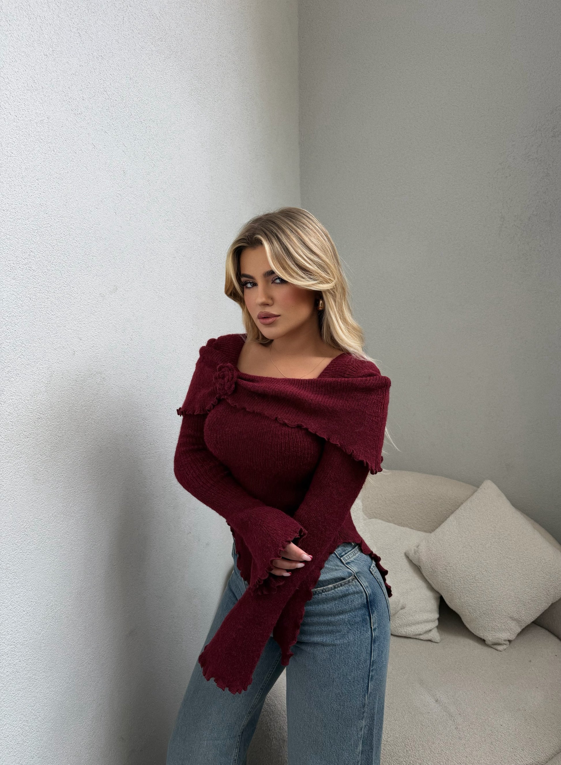 Pulover vishnje me supe jashte. Vjen me nje trendafil tek pjesa e jakes. Eshte shume stil dhe e vecante. Material i plote dhe cilesi fantastike.