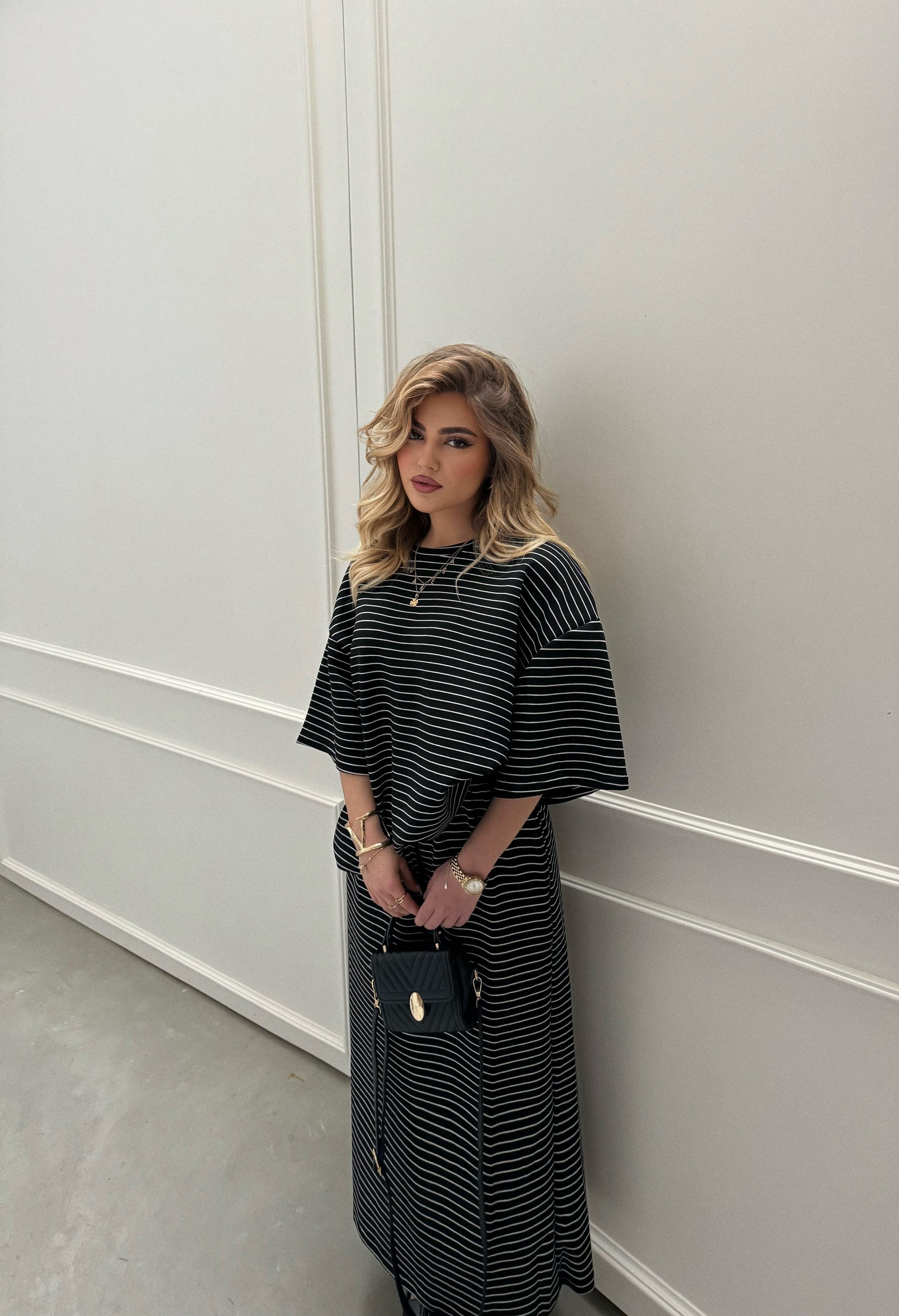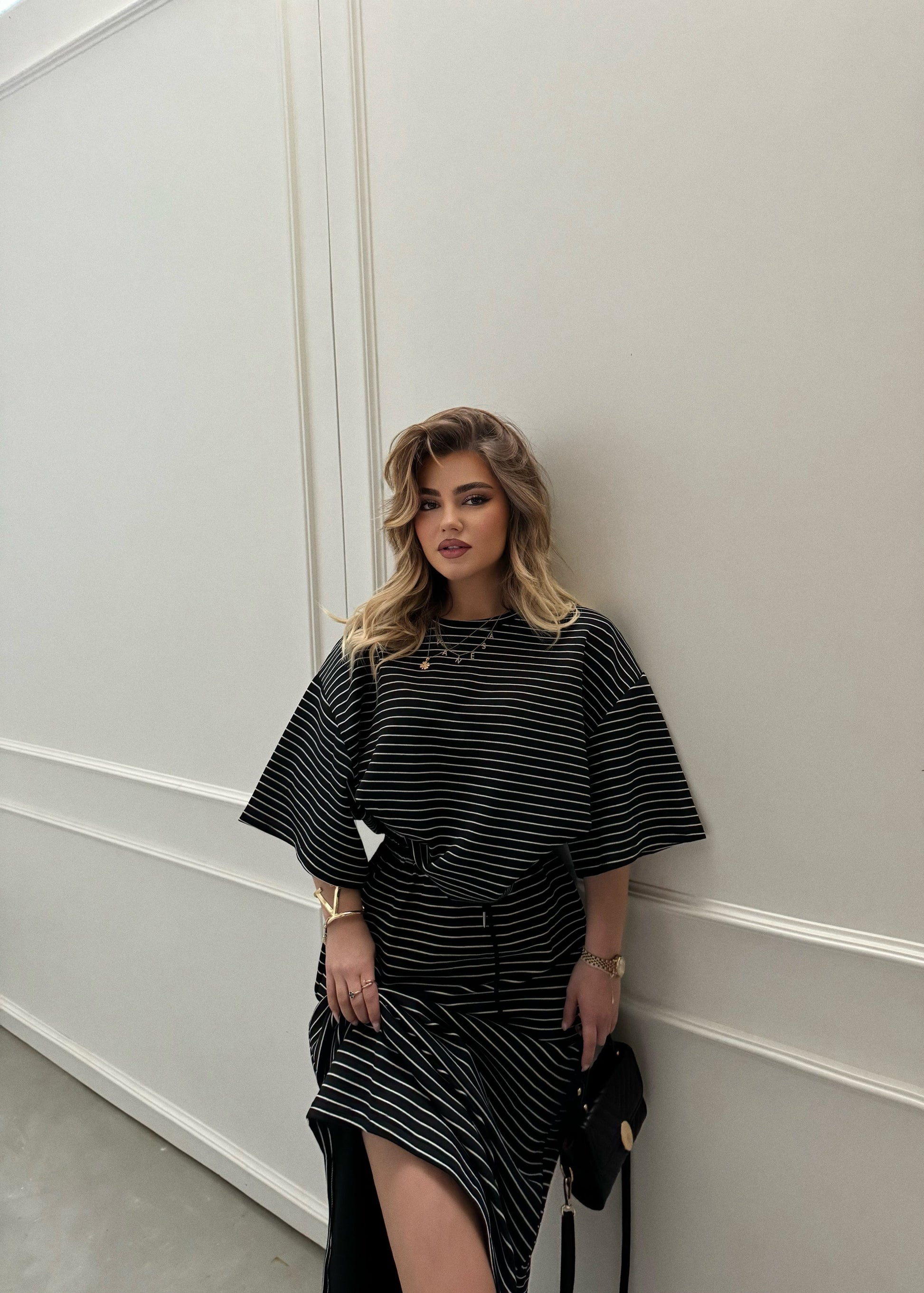 Set me bluze dhe fund me vija.Fundi eshte i lirshem dhe lidhese te pjesa e belit.Bluza eshte me menge te shkurtra.Materiali eshte i plote dhe shume i mire