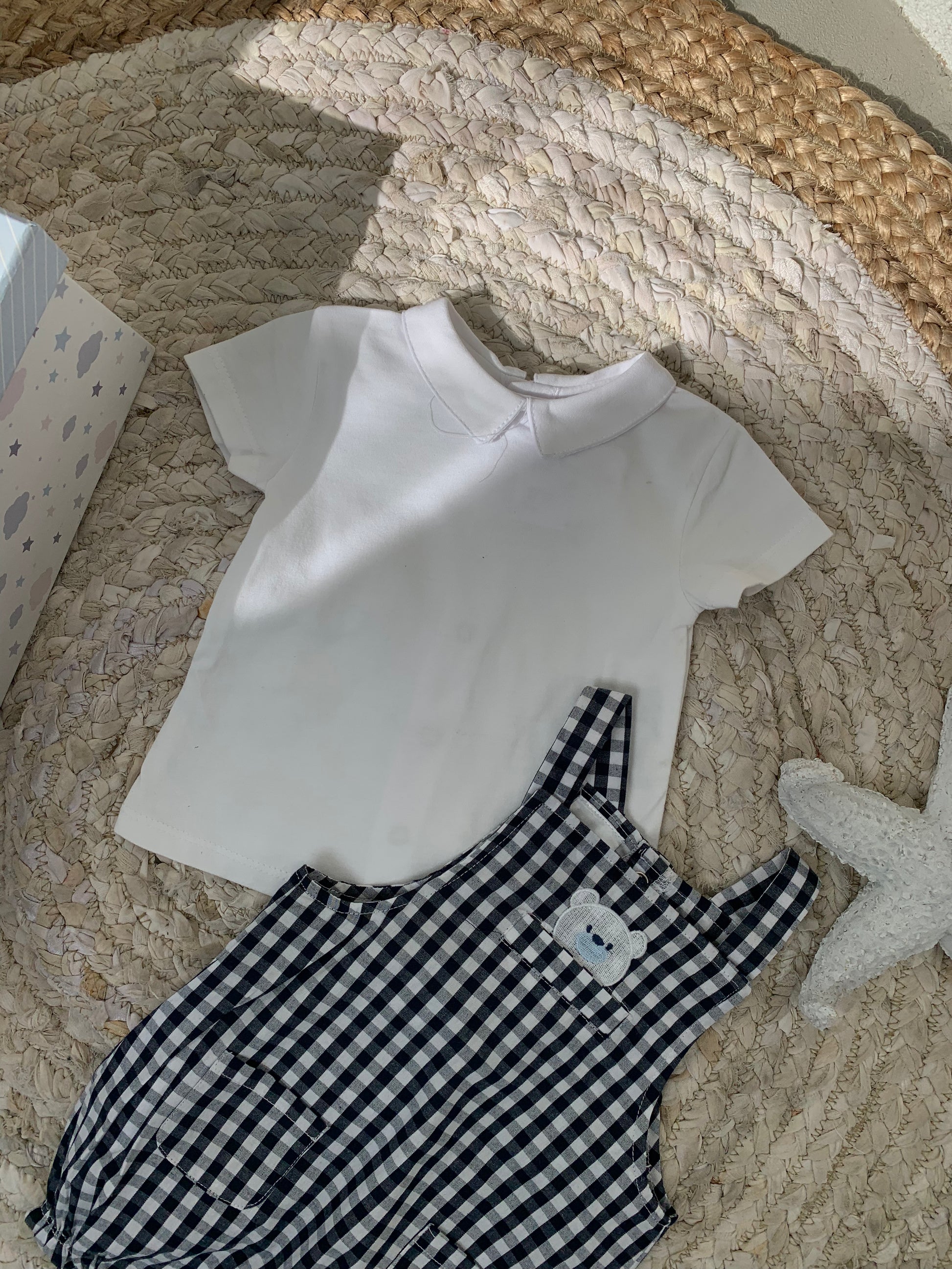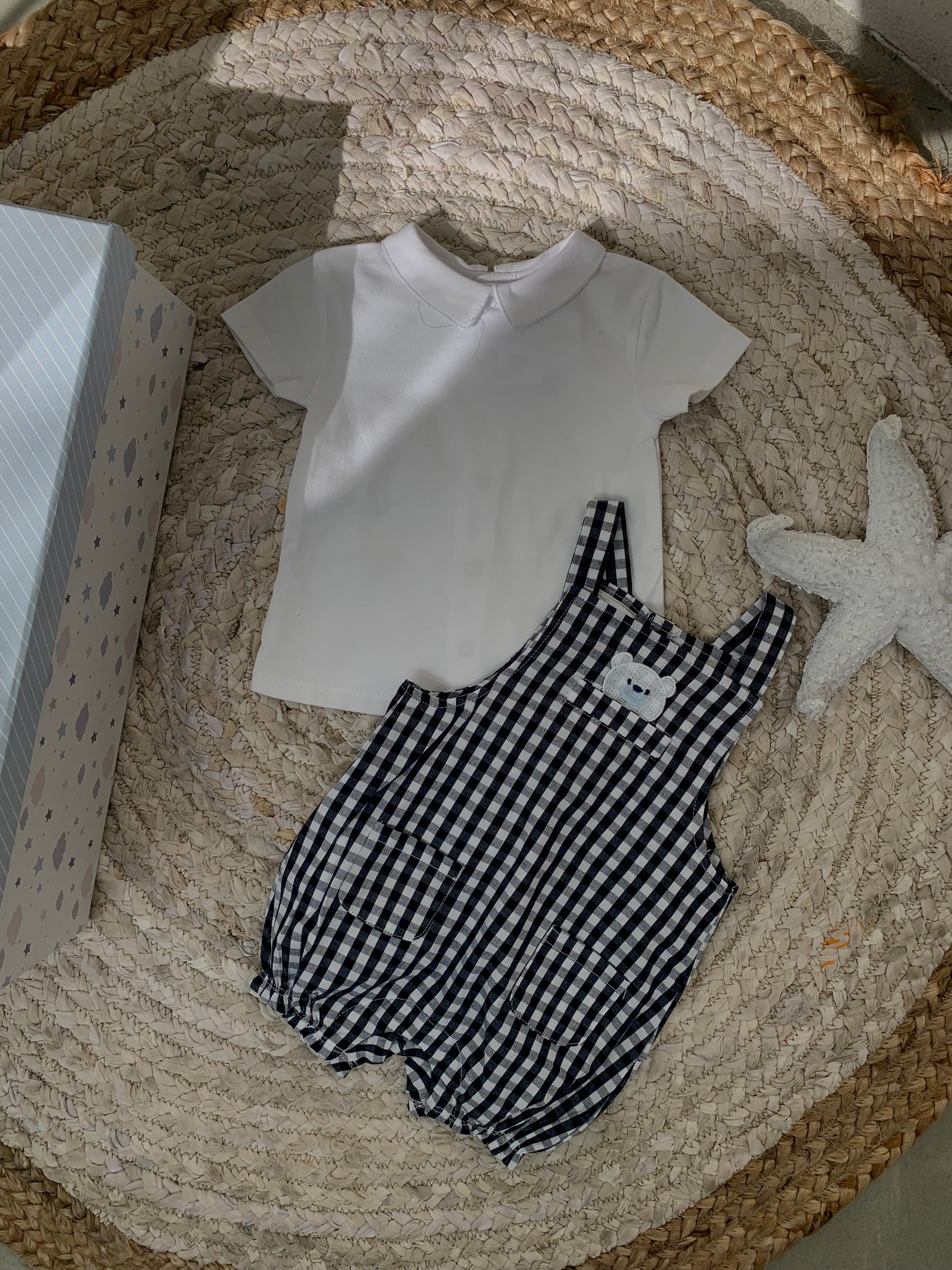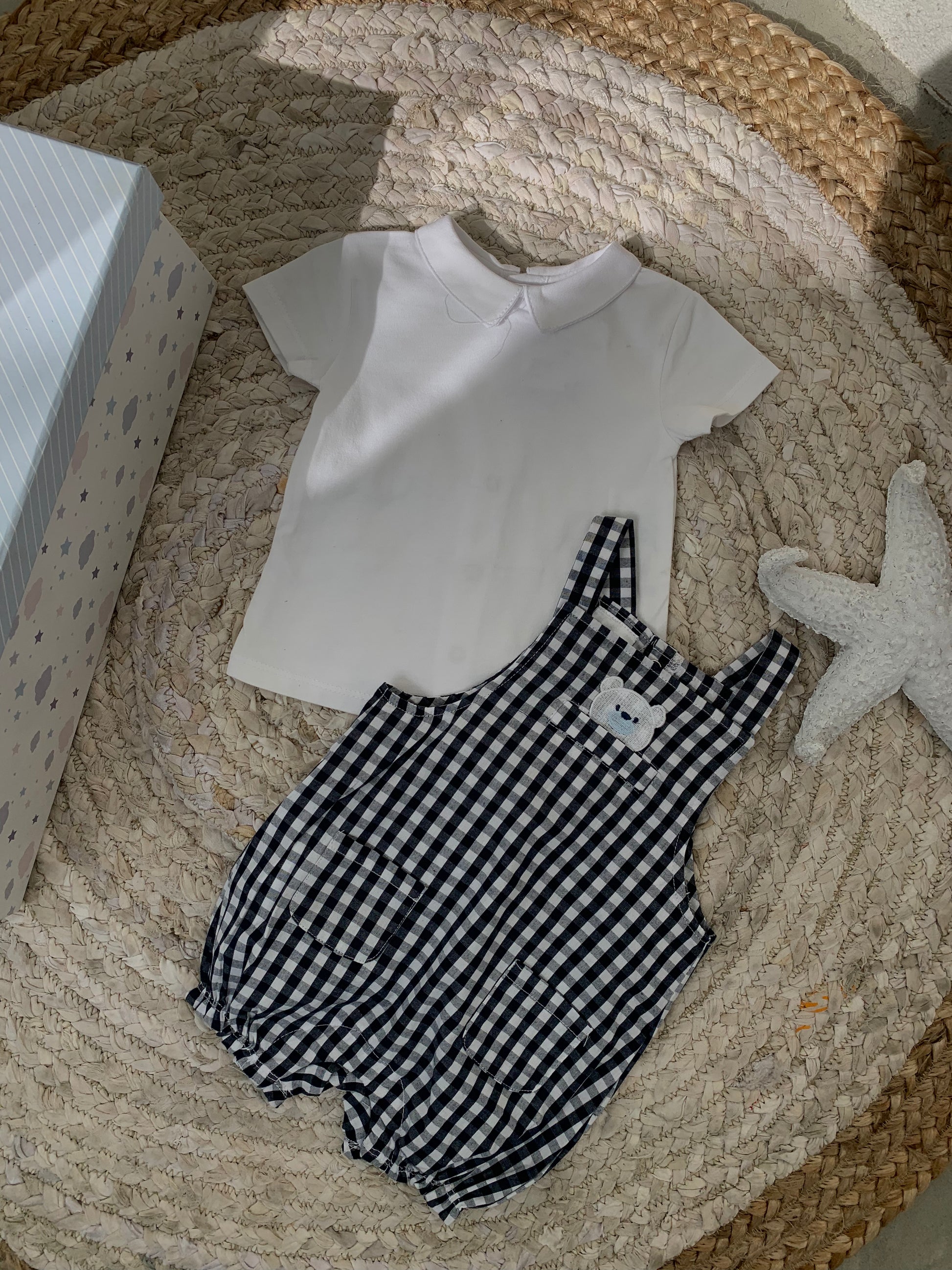 Set bluze dhe jumpsuit me viza. Bluza vjen me krahe te shkurter me jake ne forme rrethore dhe kopsa para. Jumpsuiti eshte me rripa dhe ka kopsa ne pjesen e poshtme. Cilesi fantastike dhe material i plote .