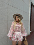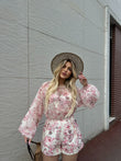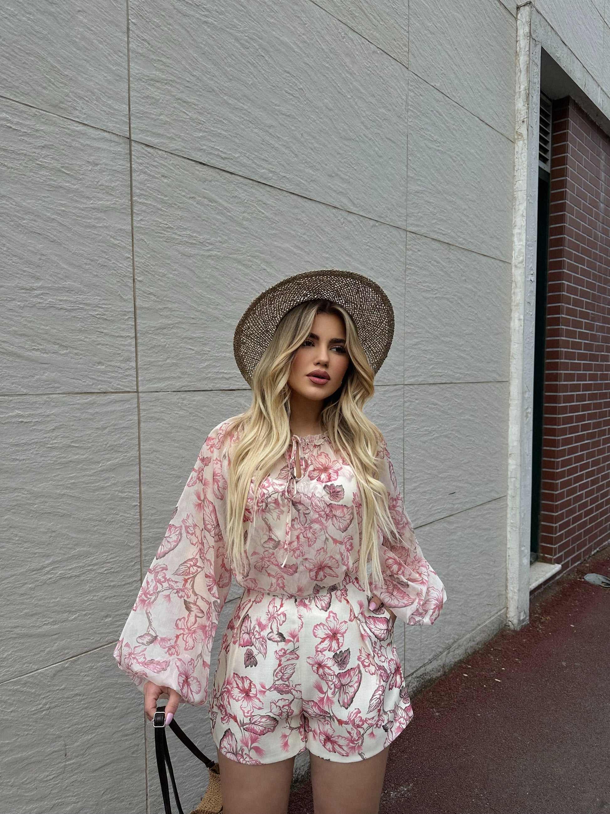 Seti perbehet nga bluza dhe pantallonat. Bluza eshte me llastik ne pjesen para, perfshihet kanatjerja. Pantallonat vijne te shkurtra. Detajet e luleve e bejne me te vecante kete produkt.