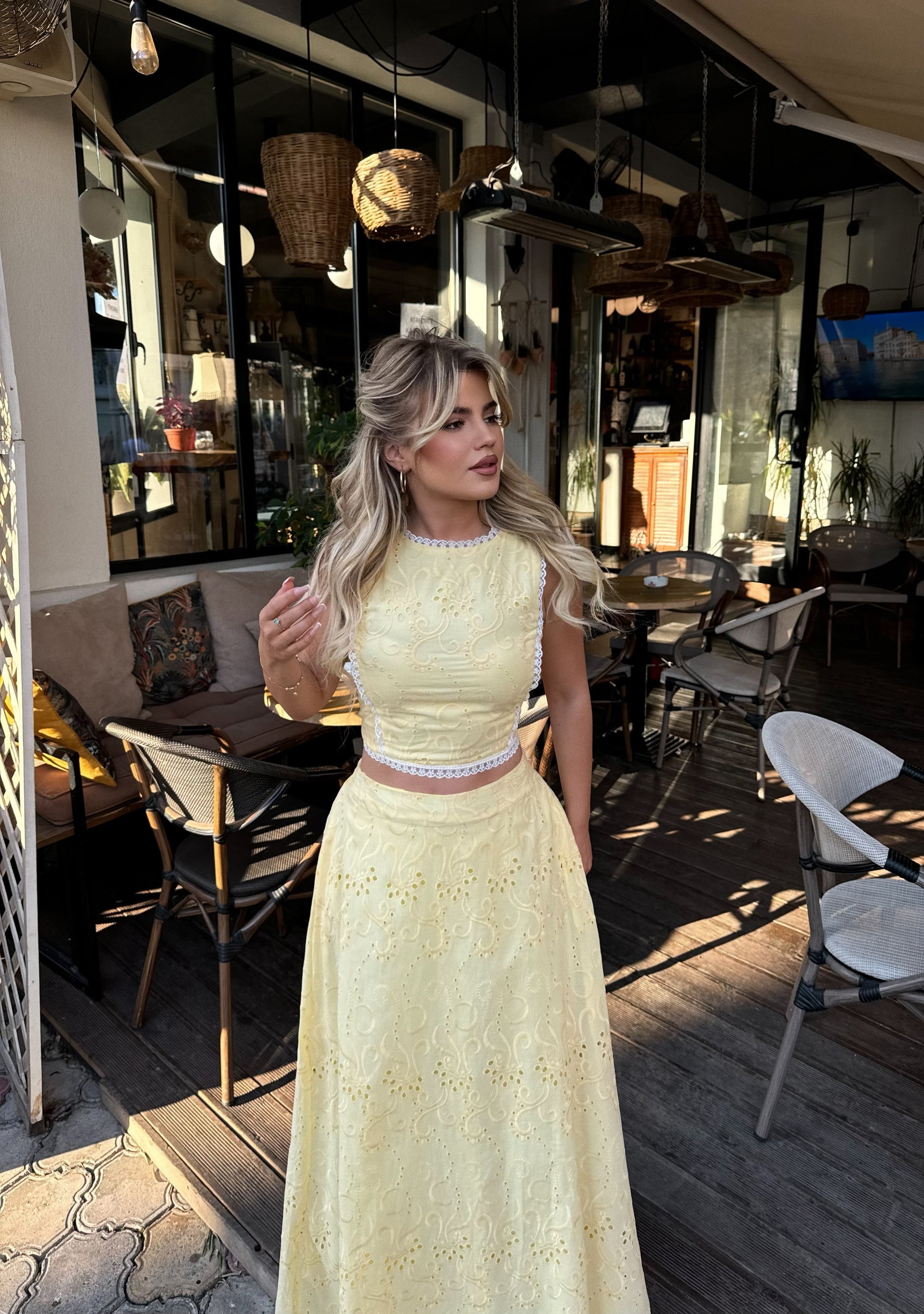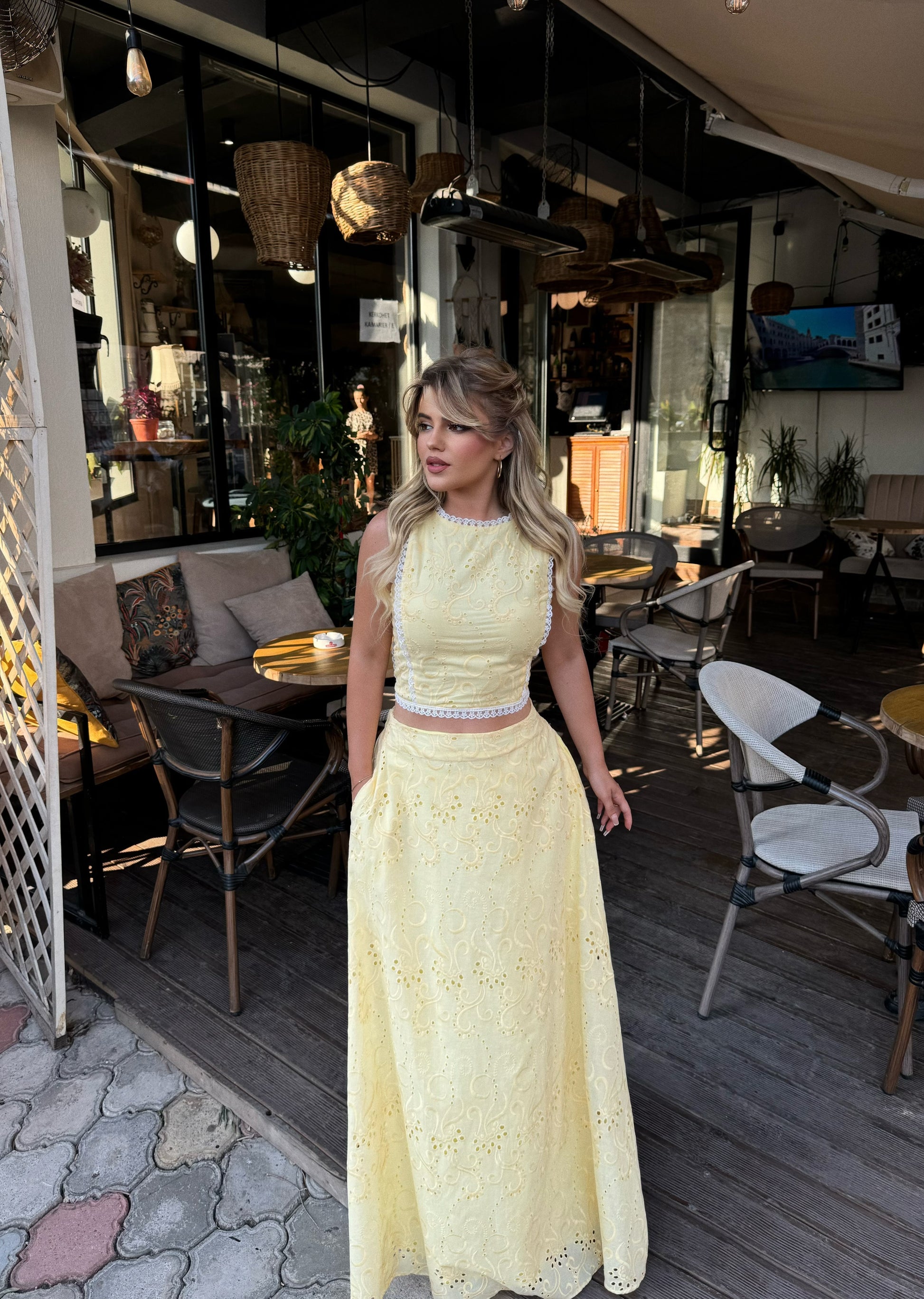 Set crop me dantelle dhe fund te gjate. Vijne me astar poshte. Material lino.