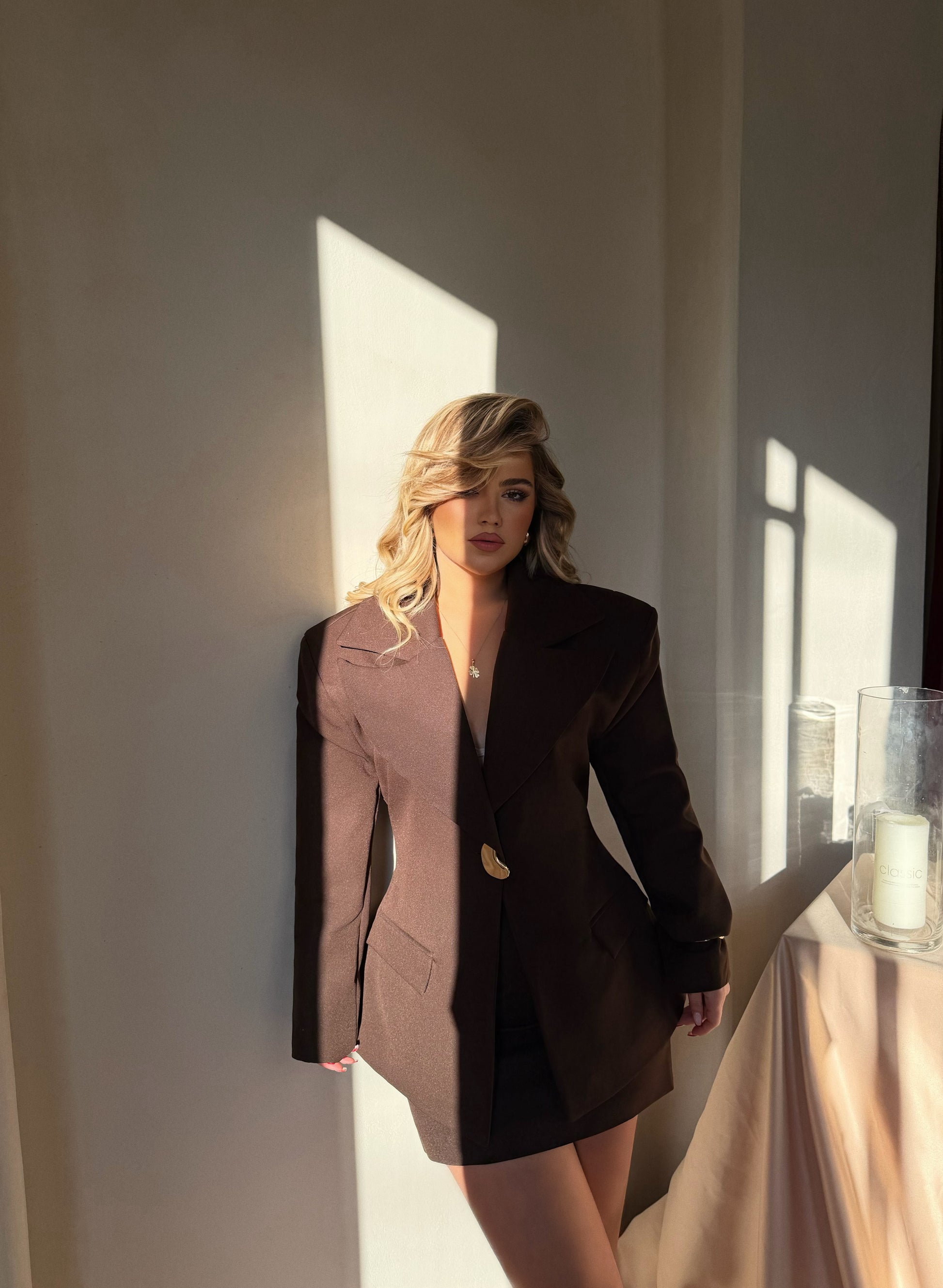 Set klasik ne ngjyren kafe. Seti perbehet nga dy pjese fundi dhe xhaketa klasike me nje togez ne ngjyren gold. Perfekte perbehet nga dy nje look te vecant dhe elegant.