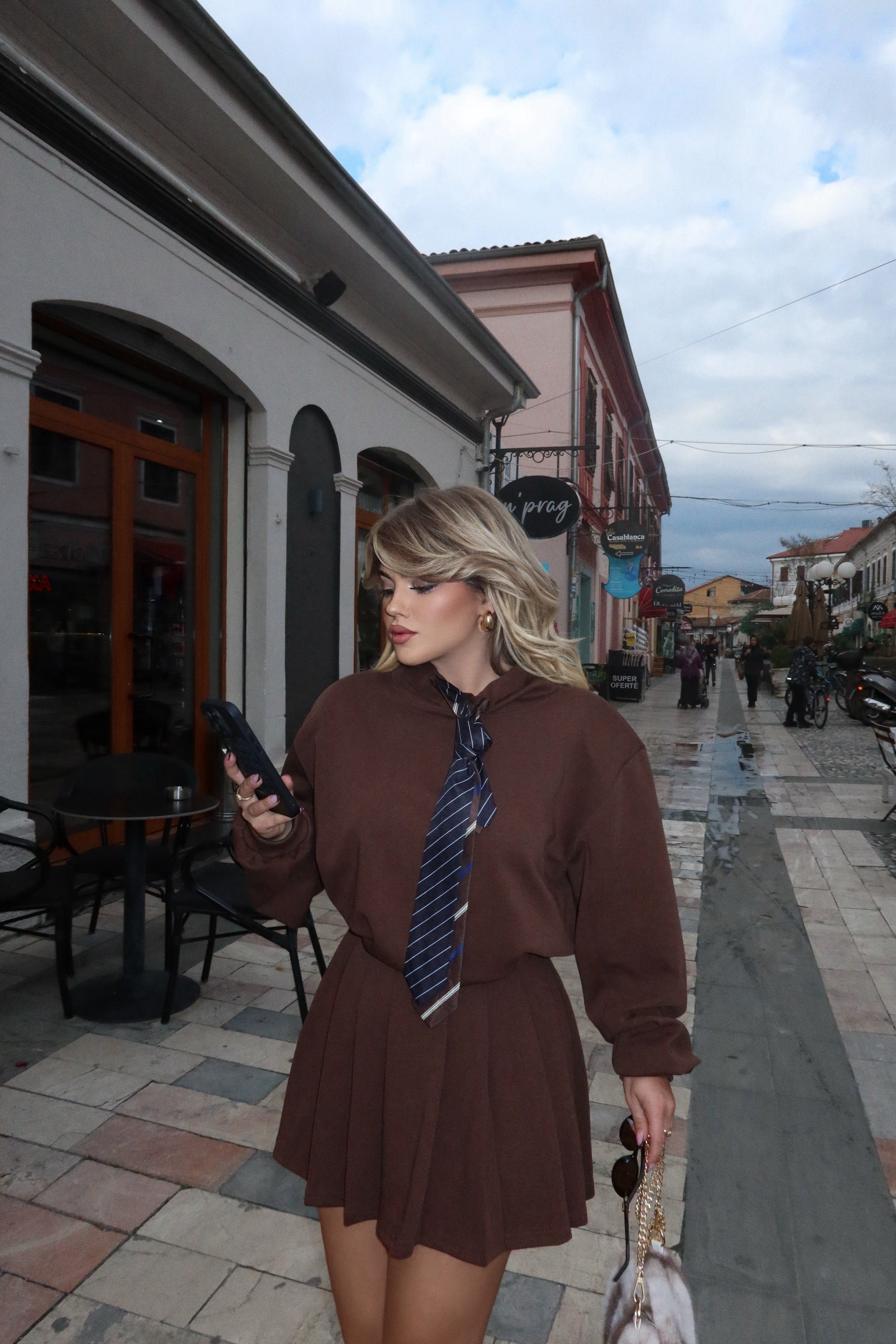 Set me dy pjese ne ngjyren kafe. Seti perbehet nga hoodie dhe fundi me pala i cili eshte i shkurter. Material i plote. Lehtesishte i kombinueshem.