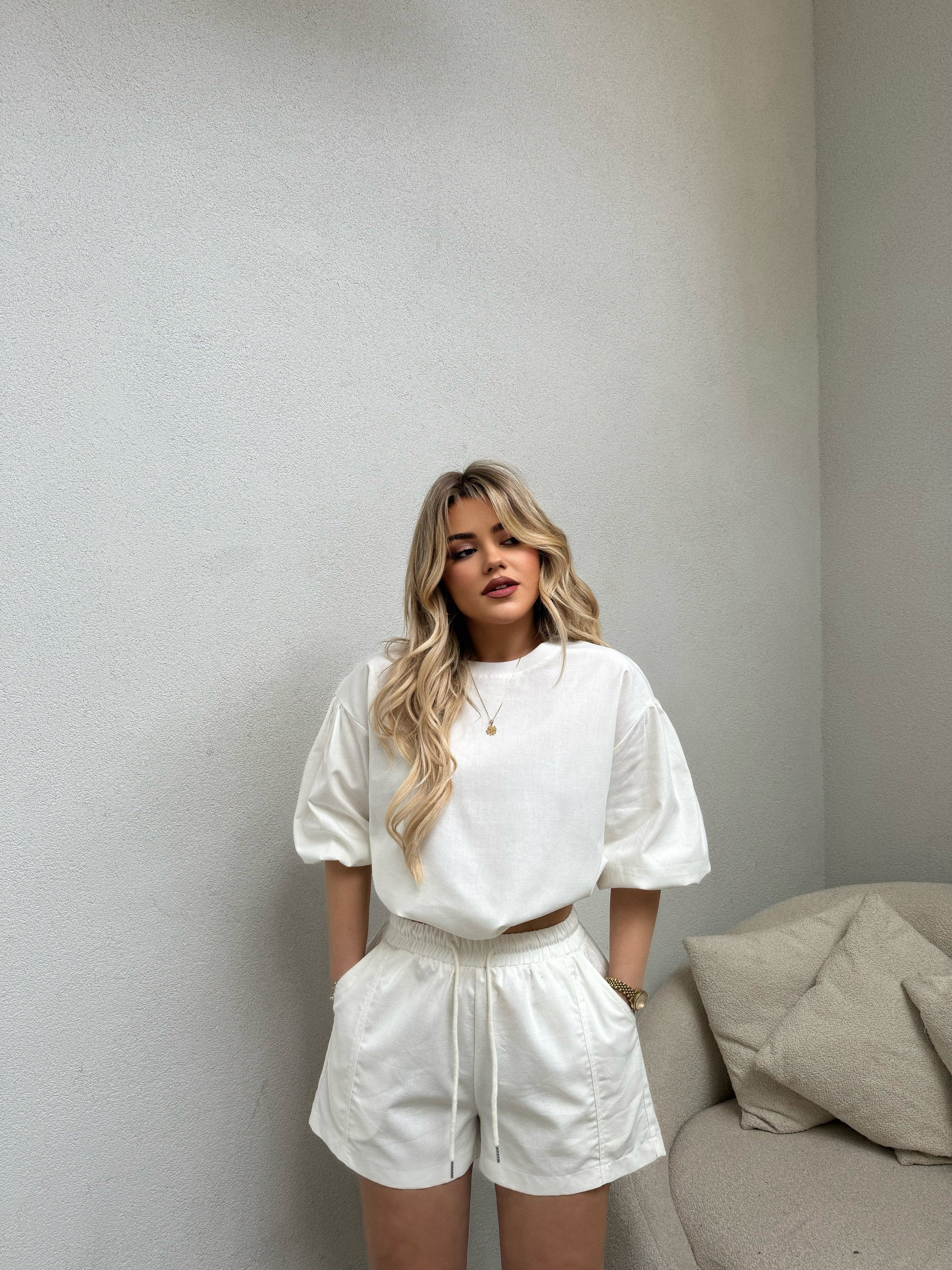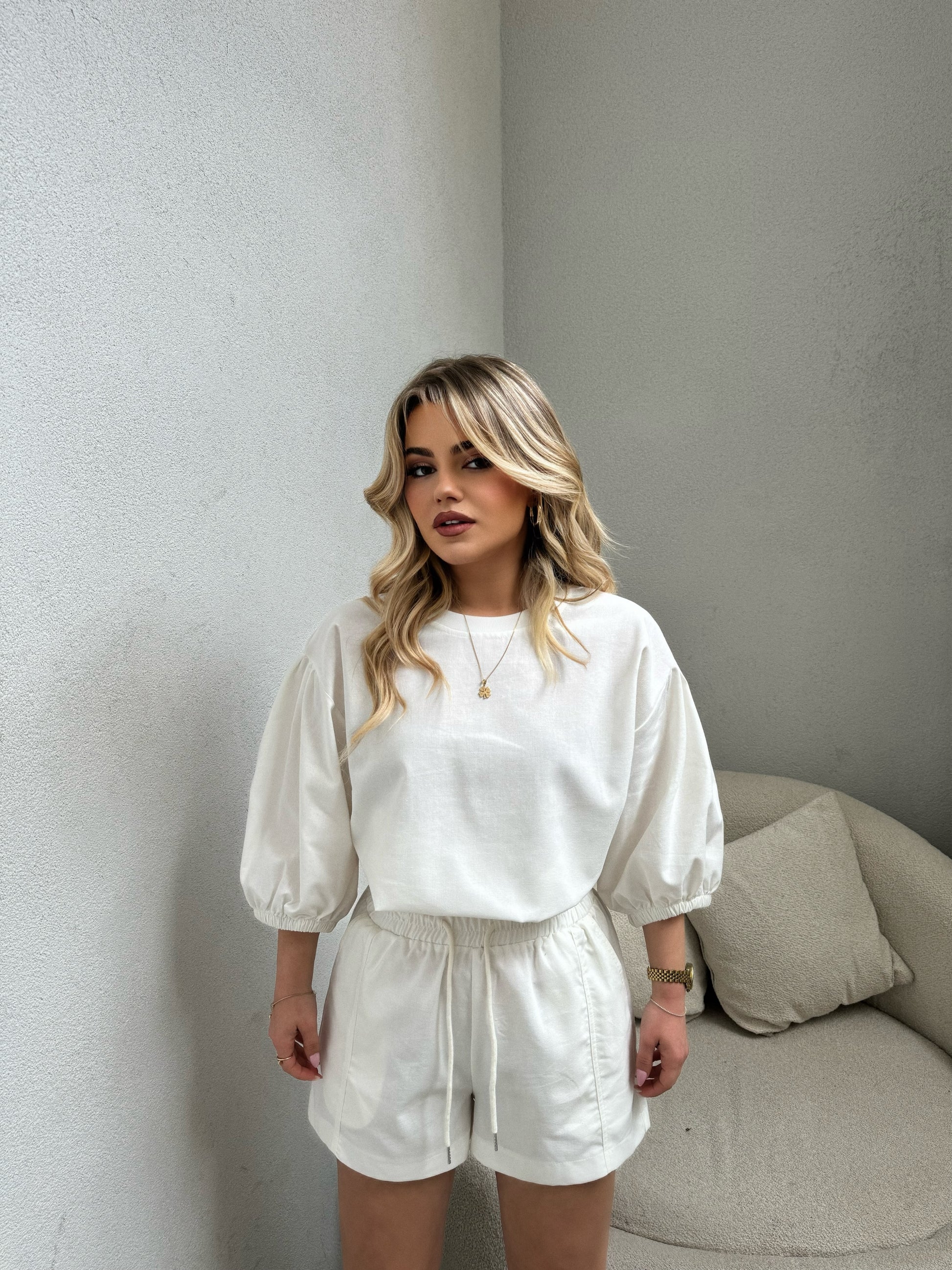 Set i bardhe i perbere nga bluza me jake rrethore dhe tutat me detajin e lidheses. Material i plote,shume komod.