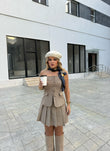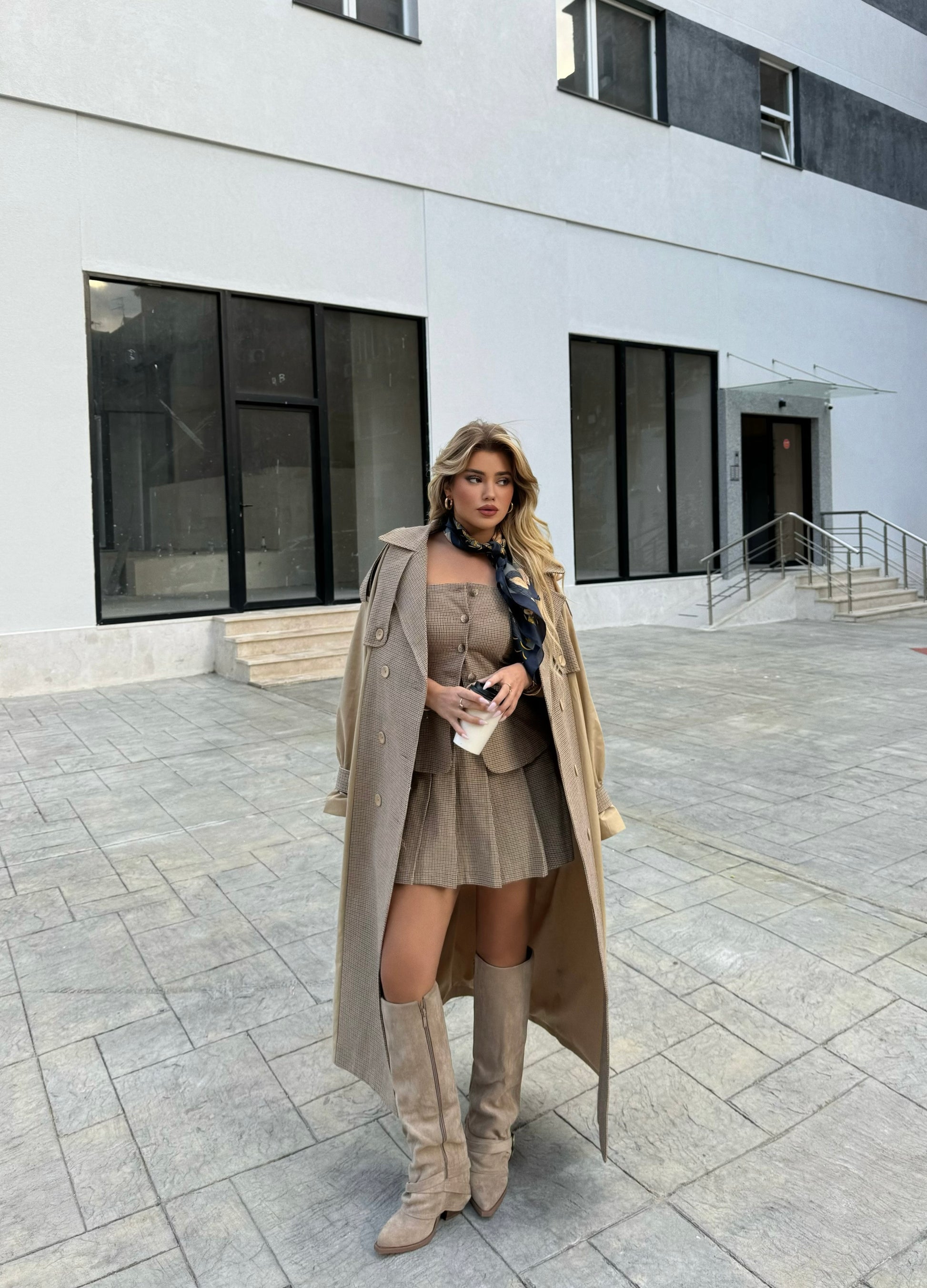 Set elegant vjen me tre pjese me pafdesy, jelekun bust me kopsa perpara, dhe dy xhepa ne pjeset ansore. Fundpantallon teper i vecant me pala ne pjesen perpara eshte i shoqeruar bashke me rripin ne ngjyren e zeze.