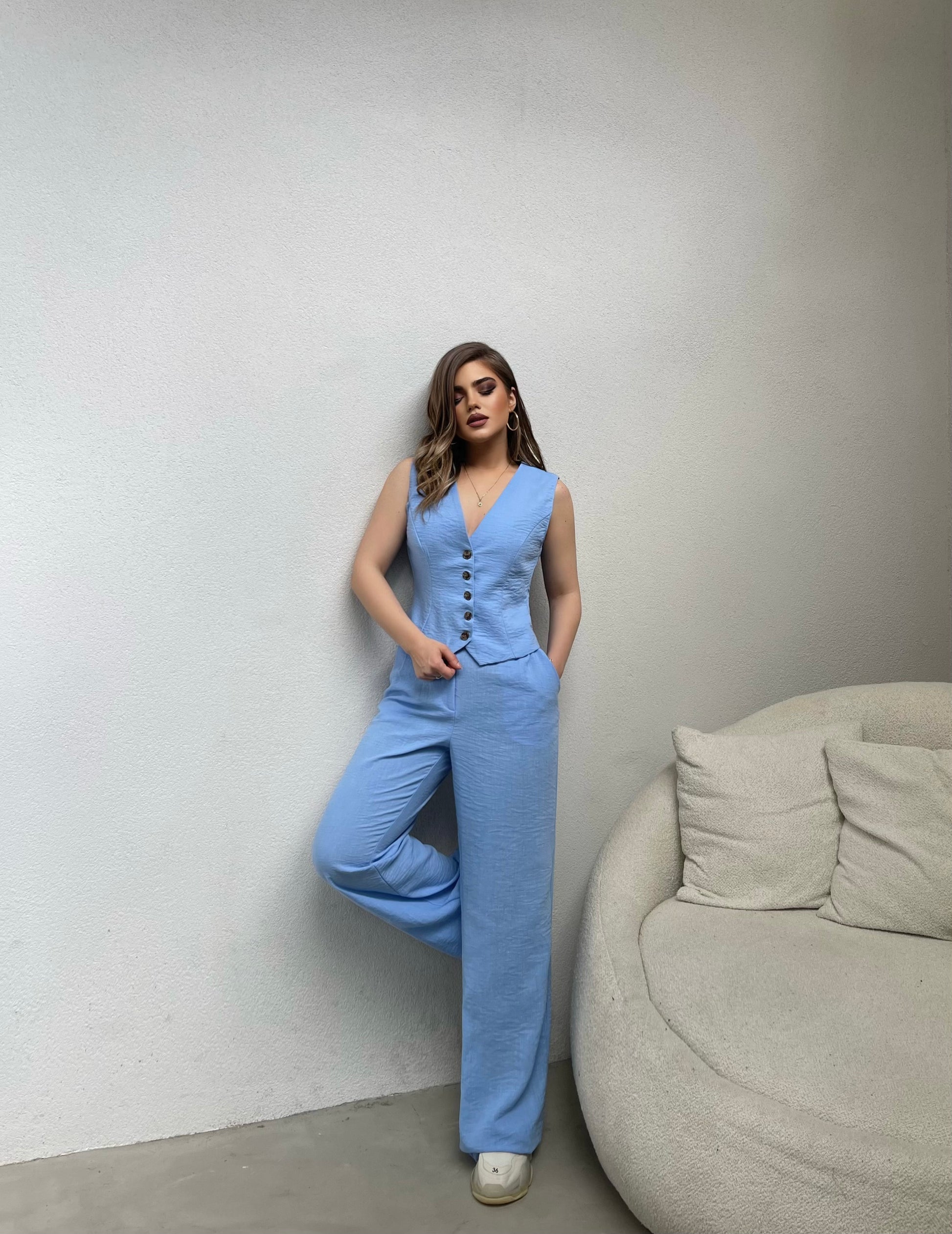 Set me jelek dhe pantallona. Jeleku vjen me kopsa para dhe jake ne forme V-je. Ka pantallonat e gjera dhe mberthimi behet me ane te kopses ne bel. Kombinohet lehtesisht me cdo veshje.