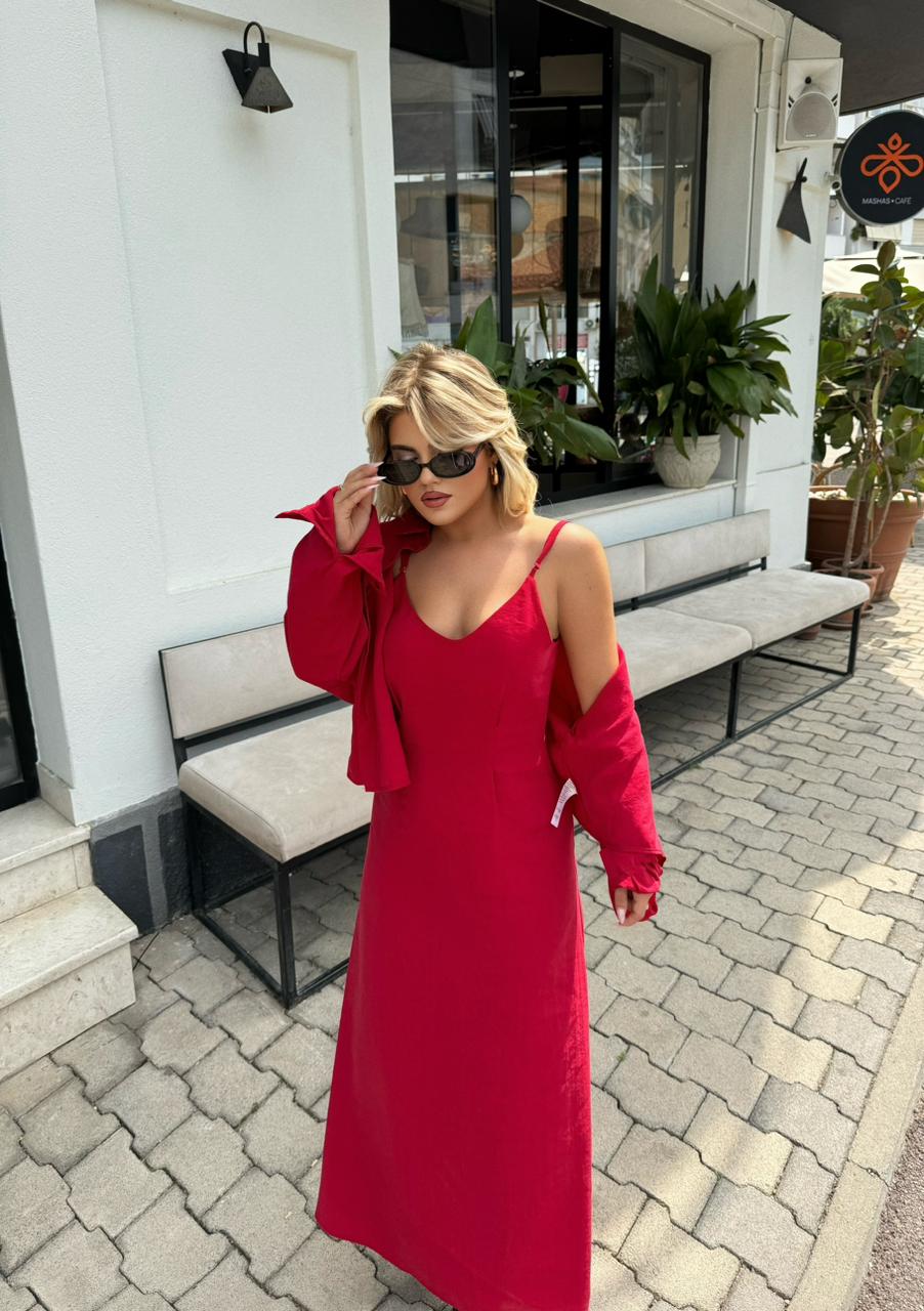 Set kemishe dhe fustan. Kemishe me menge te gjata , mbyllje me kopsa. Fustan i gjate me rripa. Material lino i plote, shume i fresket dhe komod.