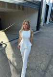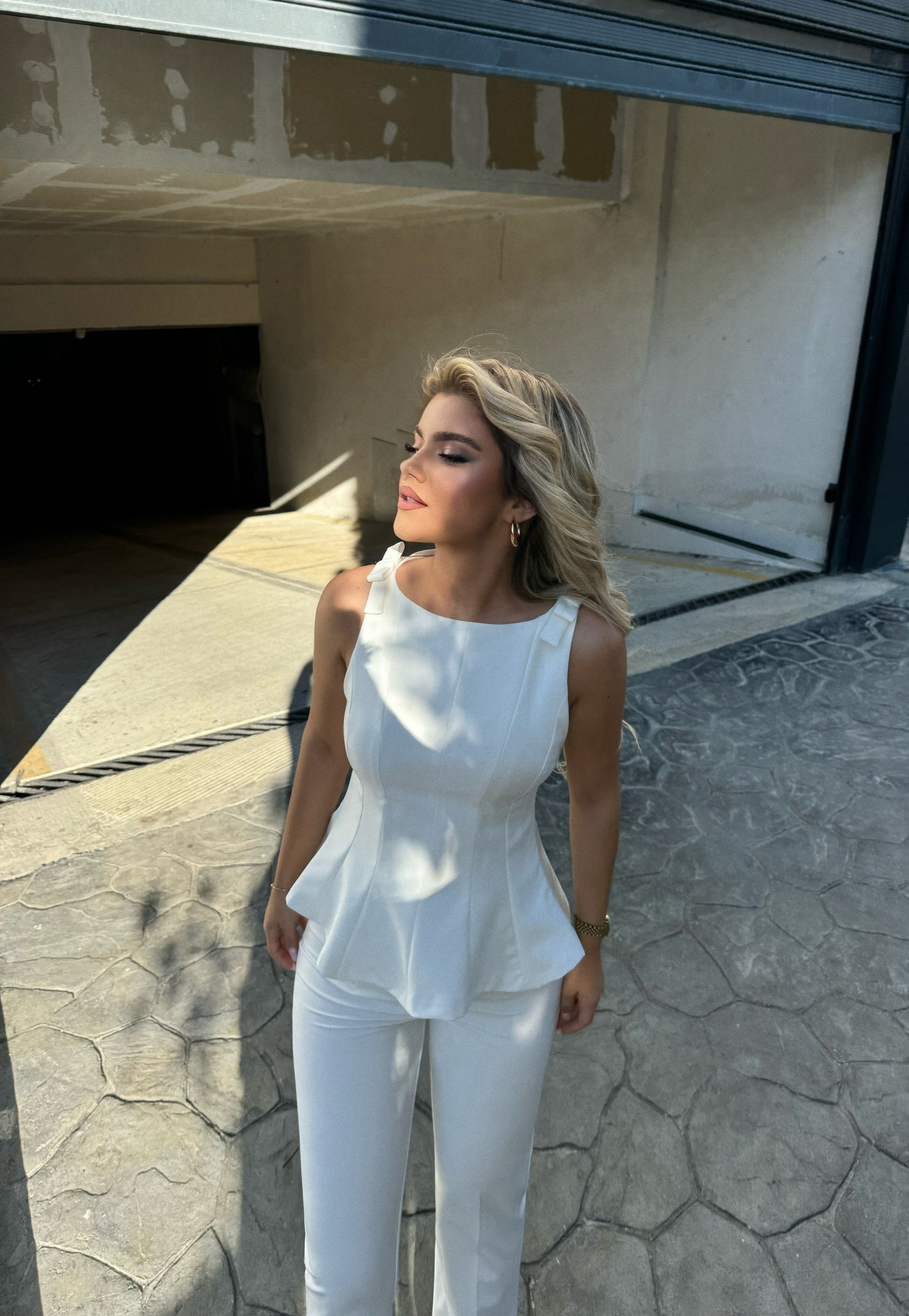 Set klasik me bluze dhe pantallona te gjata. Eshte ne ngjyren e bardhe dhe i thjeshte. Stil dhe i vecante. Ka material te plote dhe cilesi fantastike.