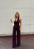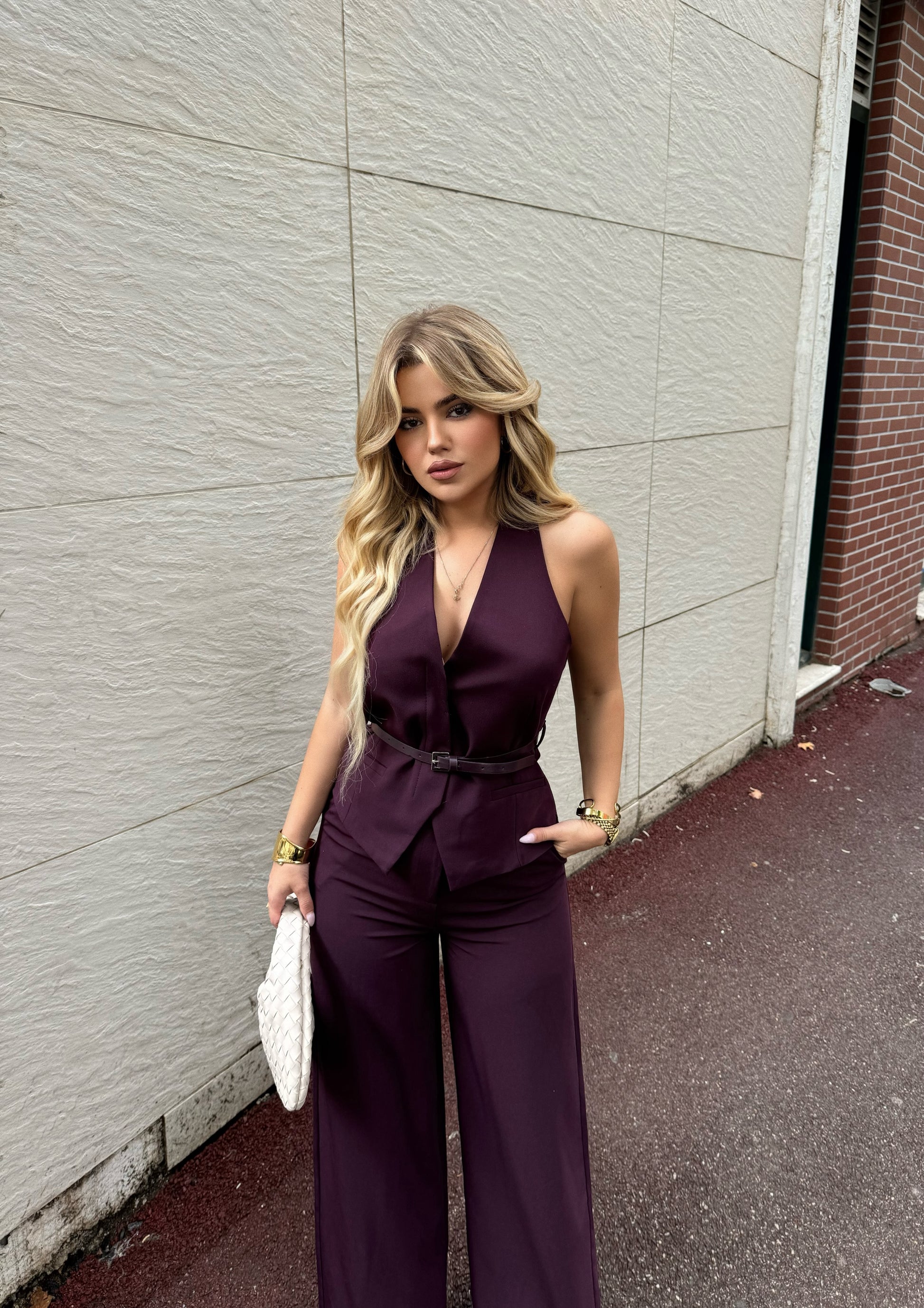 Set klasik me dy pjese. Eshte me jelek dhe pantallona te gjata stil i gjere. Vjen ne ngjyren vishnje dhe ka material te plote. Rri yll ne trup. Stil dhe komod.