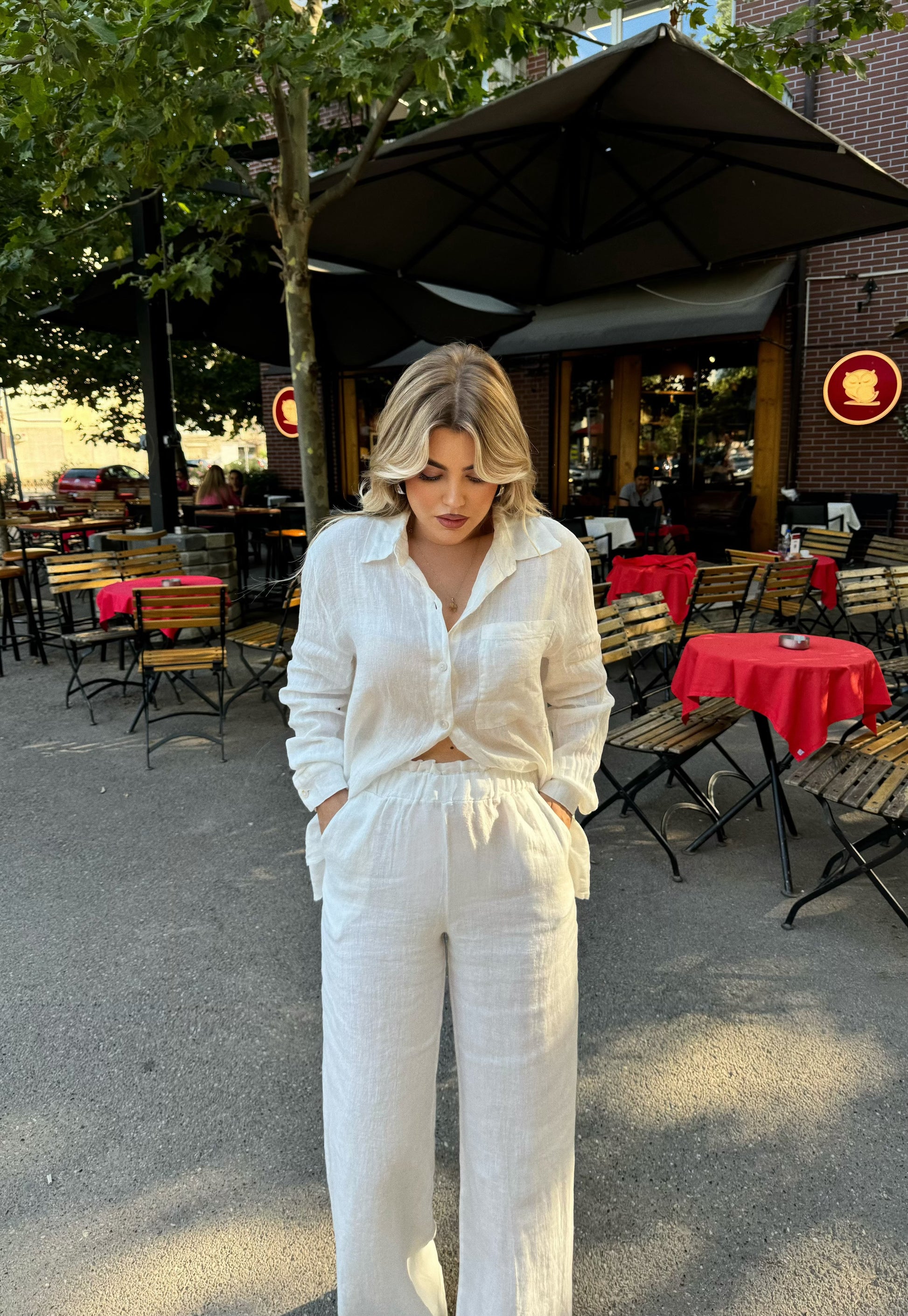 Set lino me dy pjese. Eshte me kemishe dhe pantallona te gjata. Ka cilesi fantastike dhe eshte shume komod.