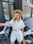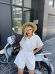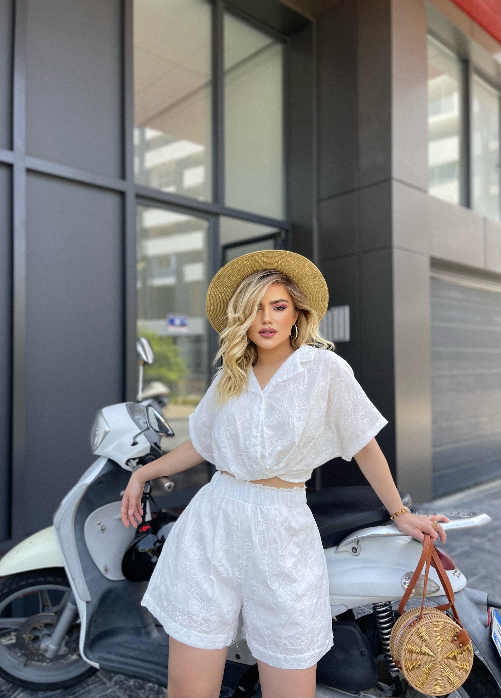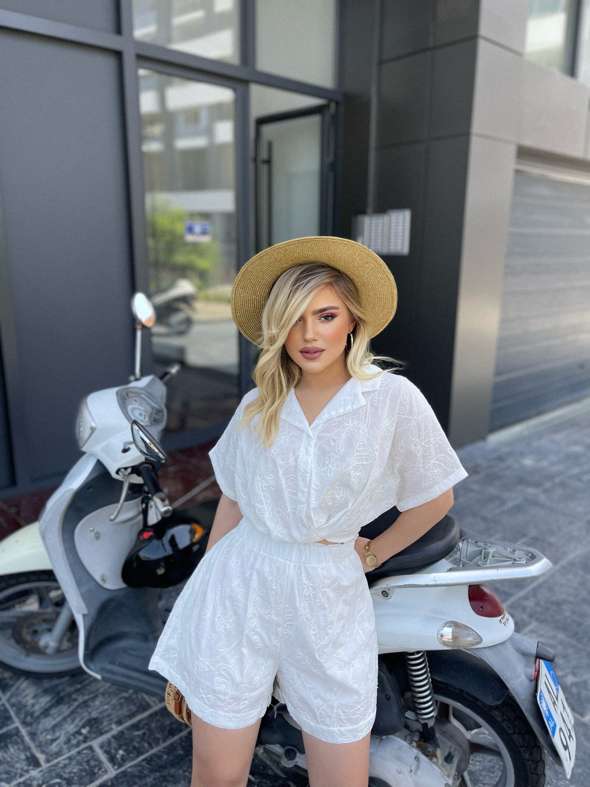 Set lino me kemishe dhe pantallona te shkurter. Kemisha vjen me lidhje ne bel dhe krahe te shkurter . Ka kopsa para dhe jake ne forme V-je. Pantallonat kane llastik ne bel dhe material te plote.
