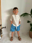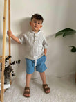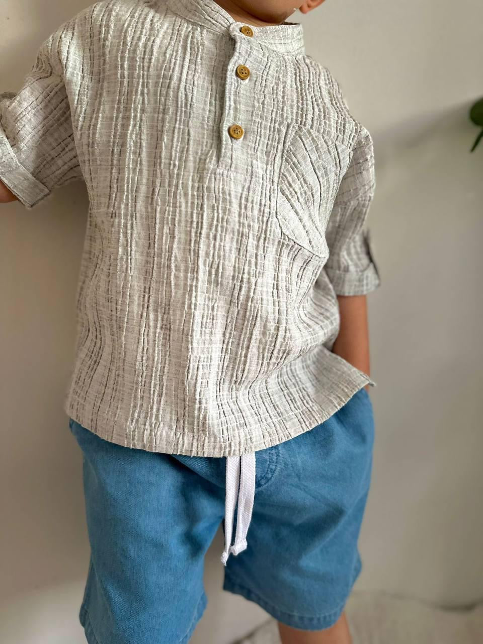 Kostum me bluze lino me kopsa dhe xhinse te shkurtra me xhepa. Ka material te plote dhe cilesi fantastike. Stil dhe shume praktik.
