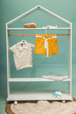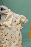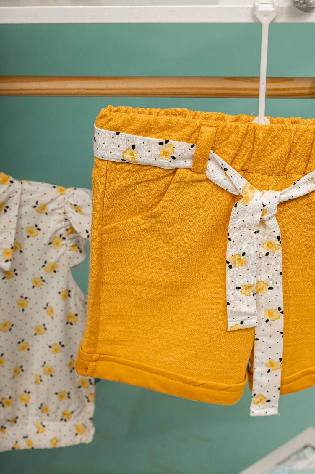 Set me bluze te shkurter dhe pantallona te shkurter. Ka bluze me llastik ne bel dhe dizenjo me lule. Pantallonat kane xhepa anash dhe rrip me lule.