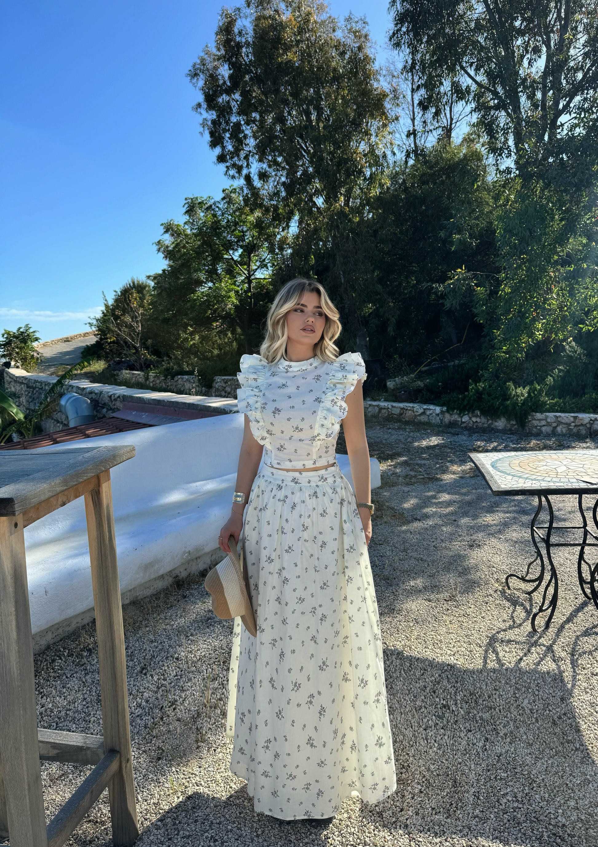 Set me crop dhe fund te gjate me detaje me lule te vogla. Cropi eshte me pala tek menget dhe fundi i lirshem. Rri yll ne trup dhe eshte teper komod. Cilesi fantastike.