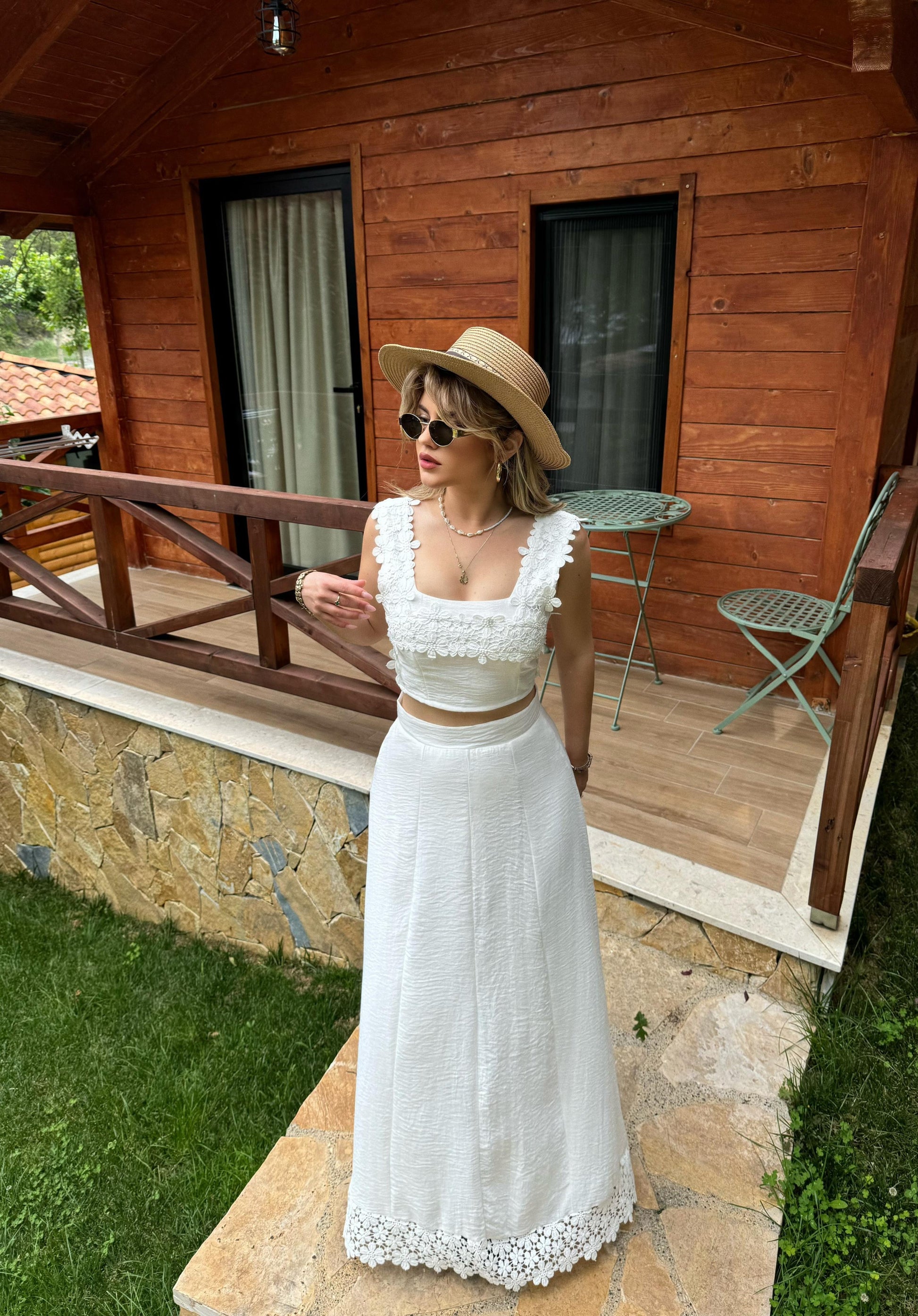 Set me crop te shkurter dhe fund te gjate ne ngjyren e bardhe. Eshte i thjeshte dhe cool. Ka material te plote dhe cilesi fantastike.
