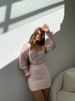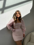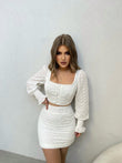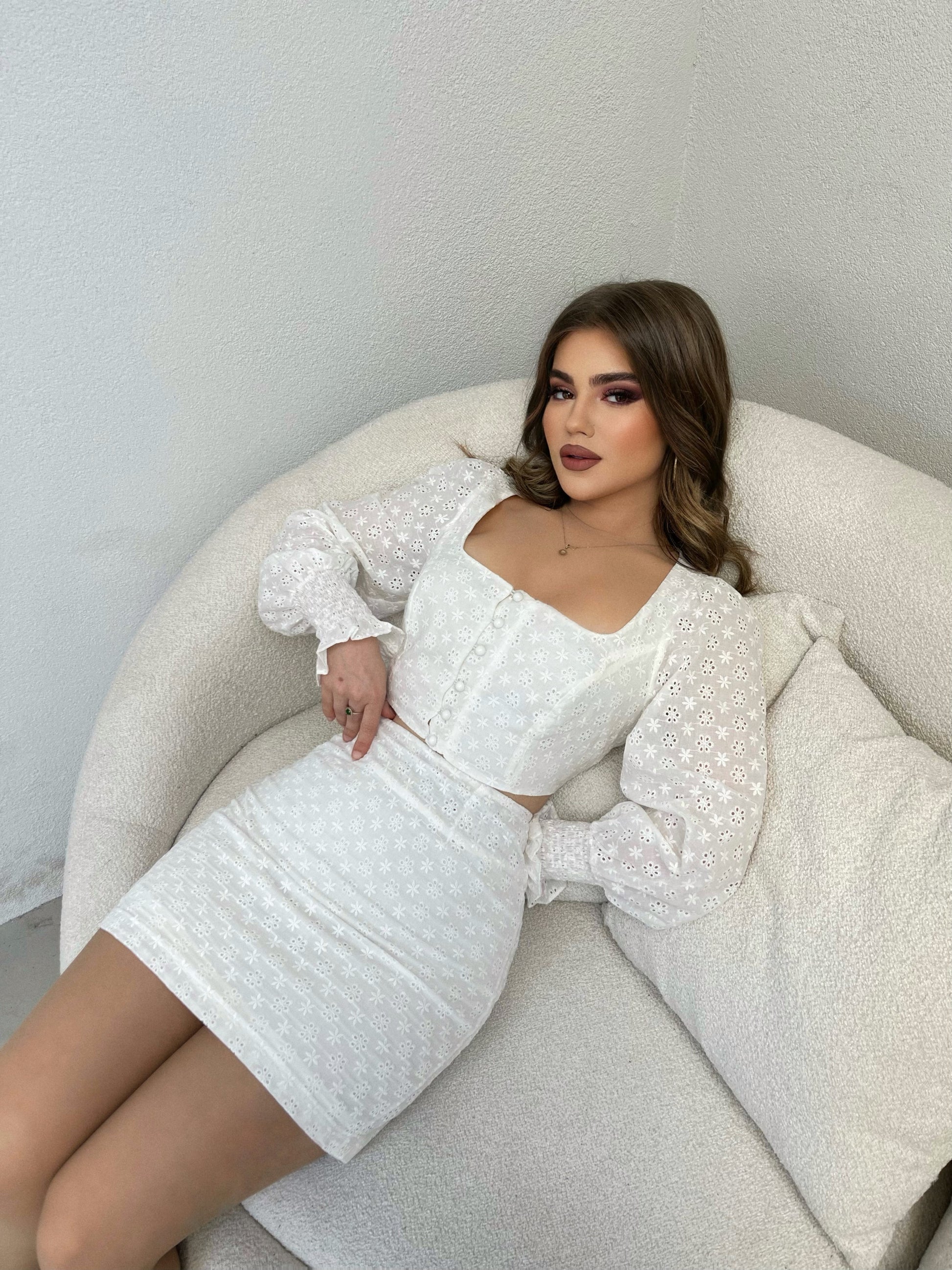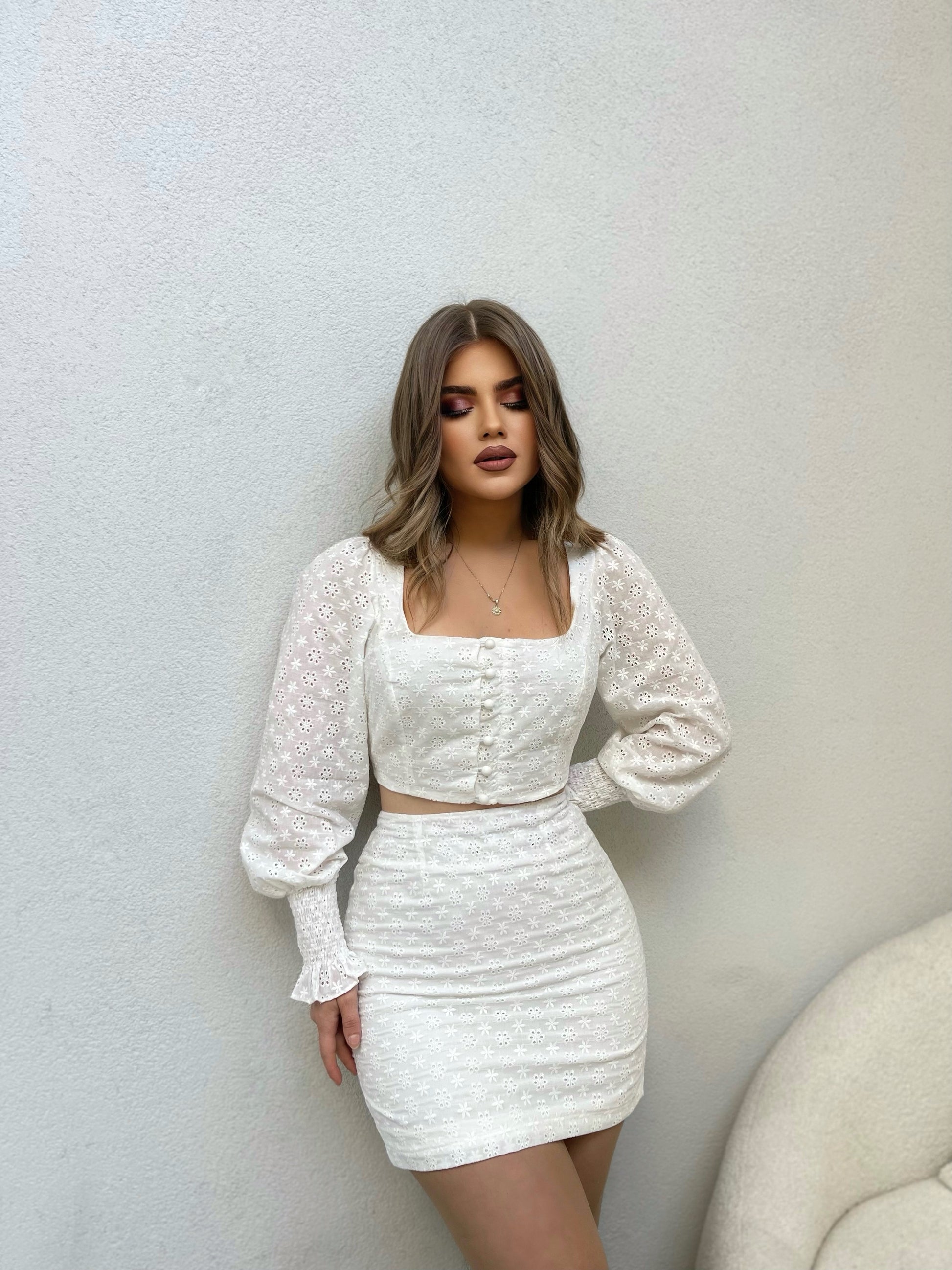 Set me crop dhe fund te shkurter. Cropi vjen me krahe te gjate dhe kopsa para. Fundi vjen i ngushte mbas trupit. Ka material te plote dhe cilesi fantastike.