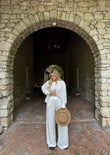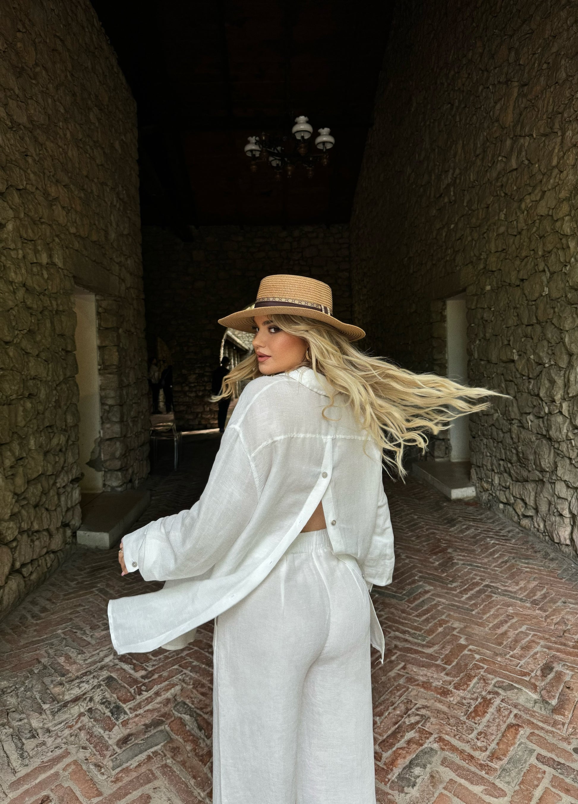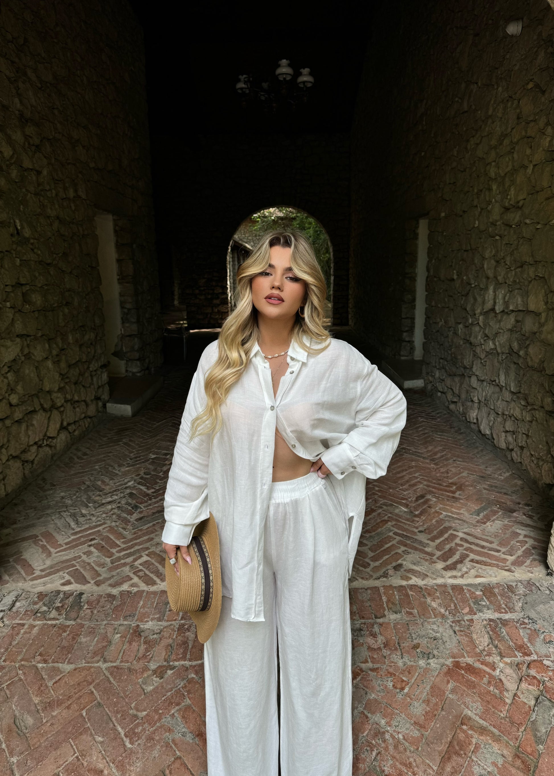 Set me dy pjese. Eshte me kemishe me kopsa para dhe pantallona te gjata. Ka material te plote dhe cilesi fantastike. Komod dhe praktik.