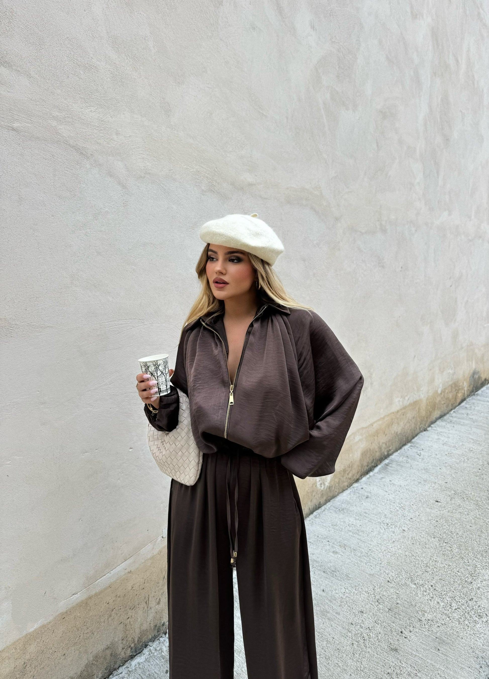 Set ne ngjyren kafe me dy pjese xhakete dhe pantallona. Material i plote me shkelqim, teper komode ne trup.