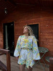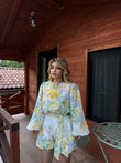 Set me dy pjese me kemishe dhe pantallona te shkurtra me rrip ne bel. Eshte me detaje me lule dhe shume komod. Material i plote dhe cilesi fantastike.