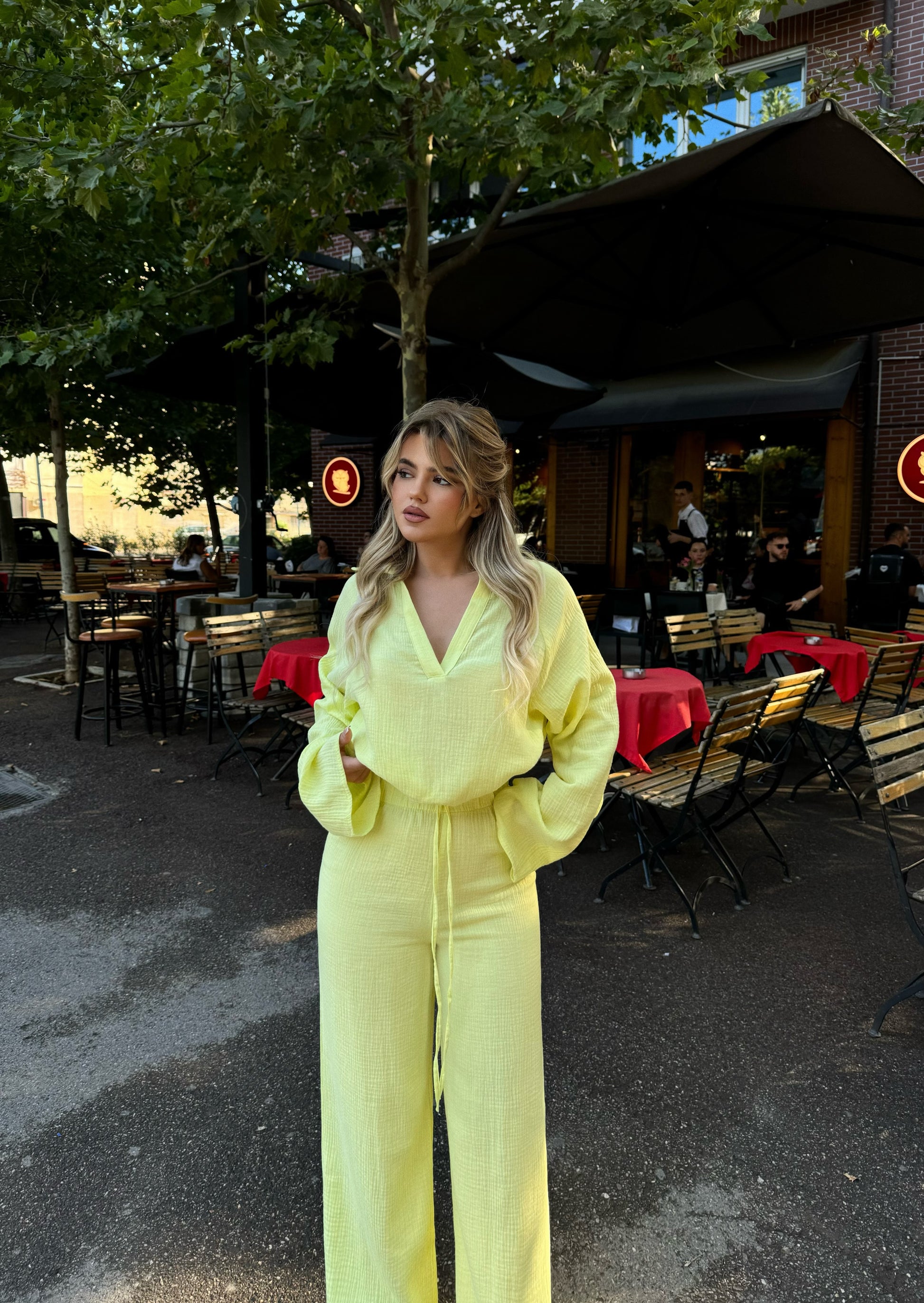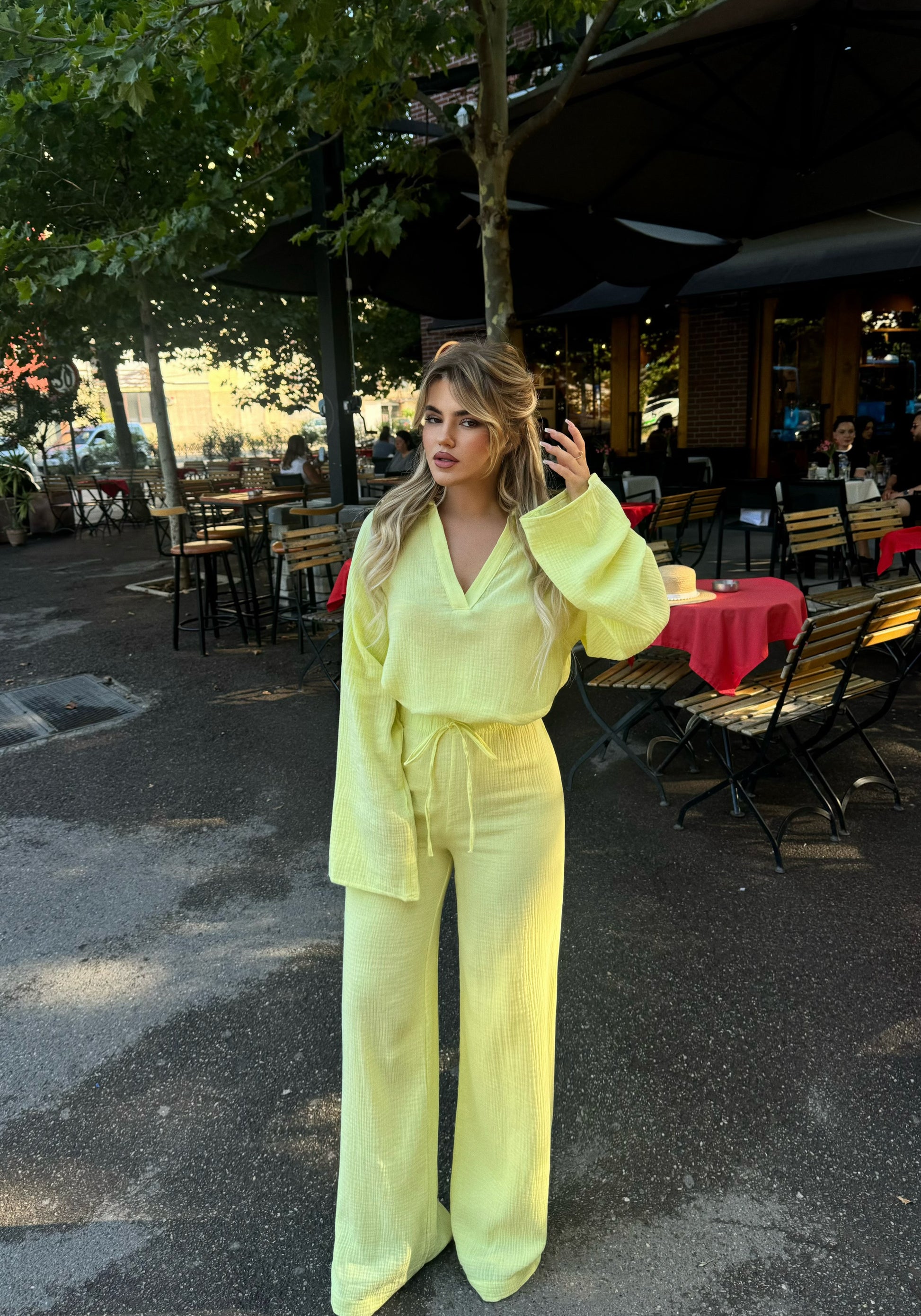 Set lino me dy pjese. Vjen me bluze dhe pantallona te gjata. Ka material te plote dhe cilesi fantastike.